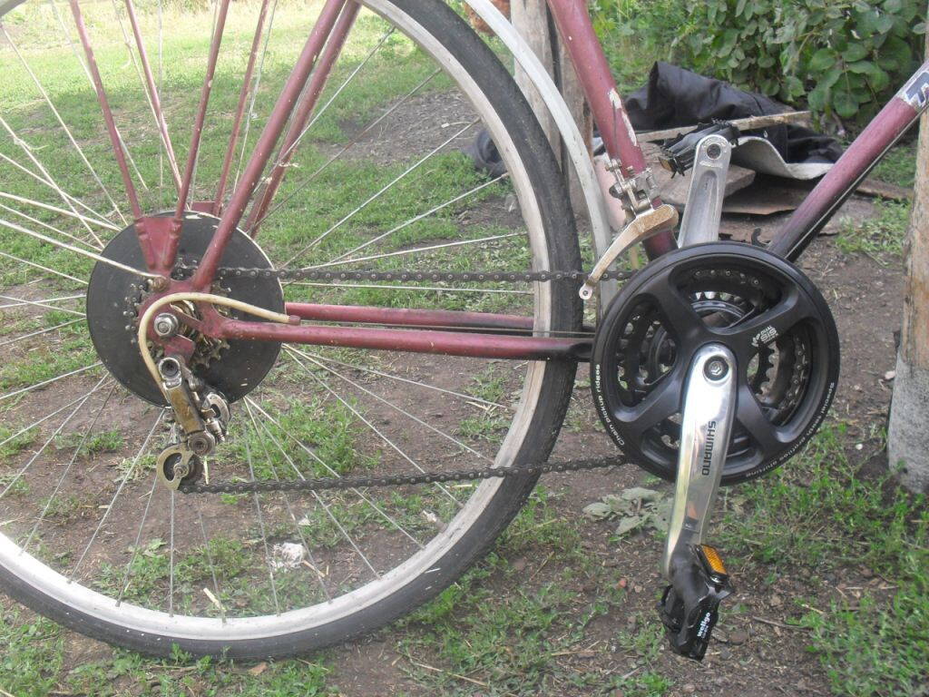 На выходных удалось добраться до родительского дома. Система, вопреки моим ожиданиями, отлично подружилась с кассетой ХВЗ (4ск), хотя бы без сильного перекоса цепи. Так же, пока что, была оставлена родная цепь, думаю должно ещё хватить на какое то время. . Хотел еще заменить родной переключатель, на переключатель универсального типа Sunrace M54 (42-32-22T 28,6mm), но его поставить не удалось, т.к. мешает крыло, а резать его не хочется.