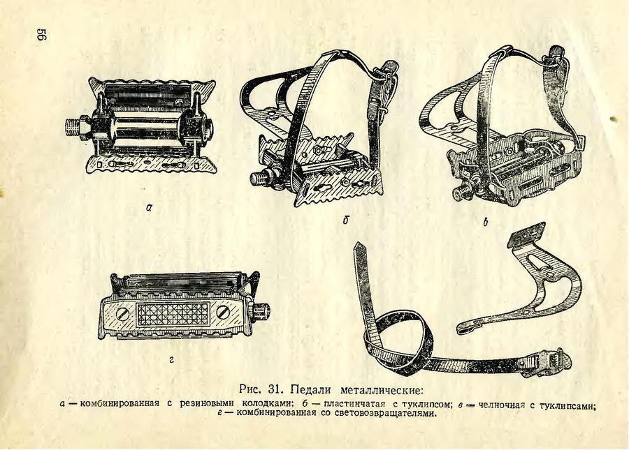 Неоднократно в начале девяностых (потом уже реже, а сегодня крайне редко) встречал на рынке именно такие педали с резинками и болтиком. Резинки убирал, ставил туклипсы и ремешок. Наличие туклипсов зависит от комплектности в продаже. Да, в деревне по грязи они ни к чему, здесь педали-топталки нужны. Вел отличный.