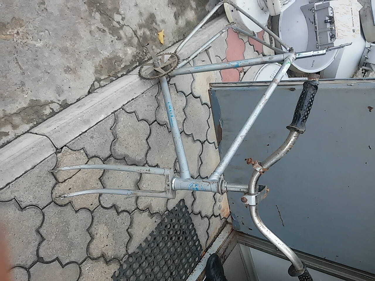 Розібрав зразу,тобто зняв те,що буде заважати доводити його до толку,-гнуті крила,багажник,ручки гальм,сідло...