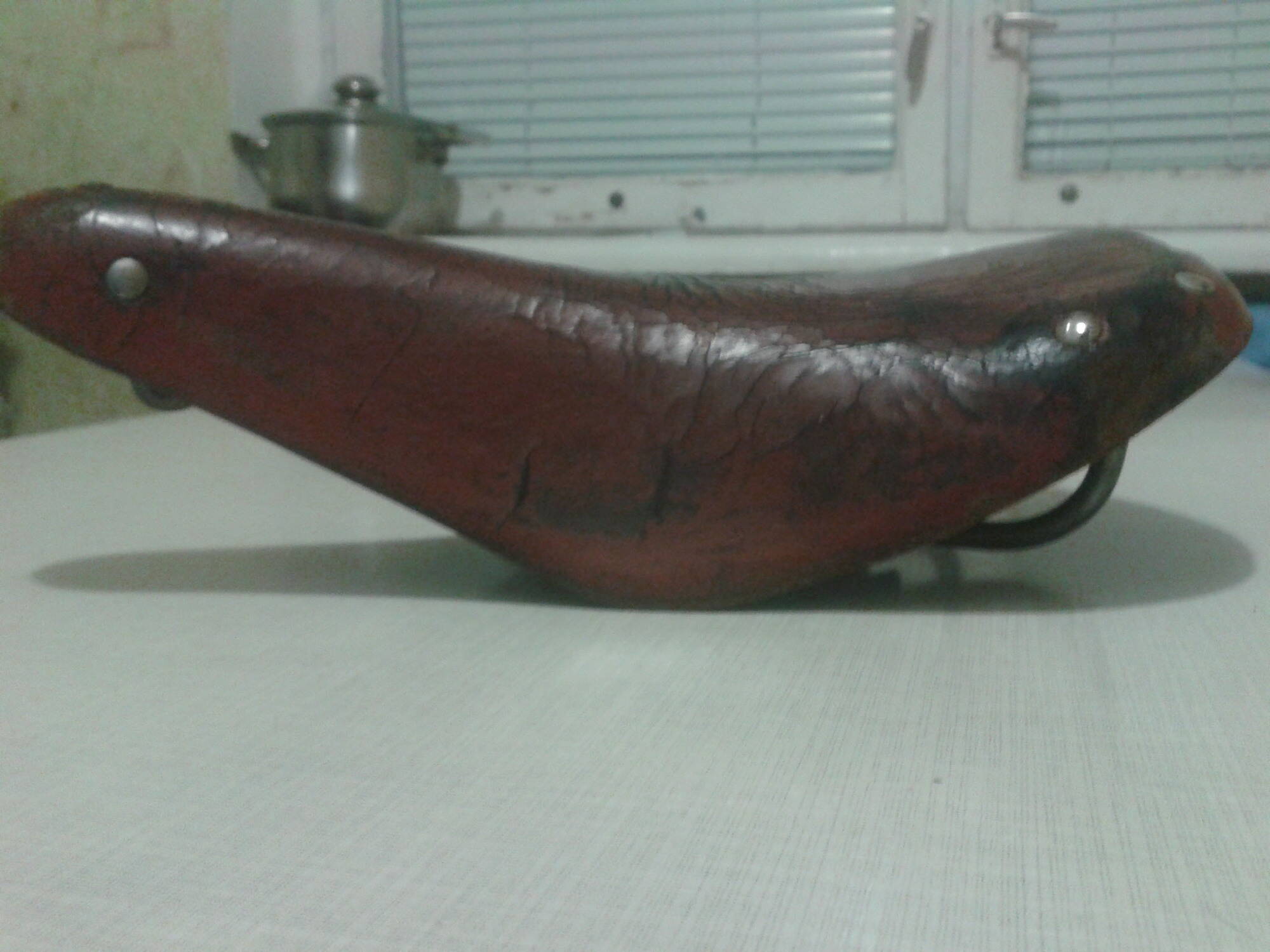 П.С. Чего боюсь. Два раза желатинил, седло стало звенеть как фанера, воск не сильно помог, боюсь, чтоб кожа не утратила гибкость и не порвалась от нагрузки жопы (80 кг), не приклеил внутренний лист кожи, т.к. когда желатинил он как-бы сам приклеился к чепраку. Думаю, не потеряется: он же тоже на винтах сидит. Надо будет - откручу и приклею. Ну и третье, надо чтоб седло не марало задницу, особенно после воска. Покатаюсь сначала в старых вратарских черных штанах, кстати, удобная вещь за неимением велоштанов- зауженные штанины и резинки на ступни. Плюс, мягкие вставки на коленях и боках- один раз помогло, когда положил вел на бок на гравии.