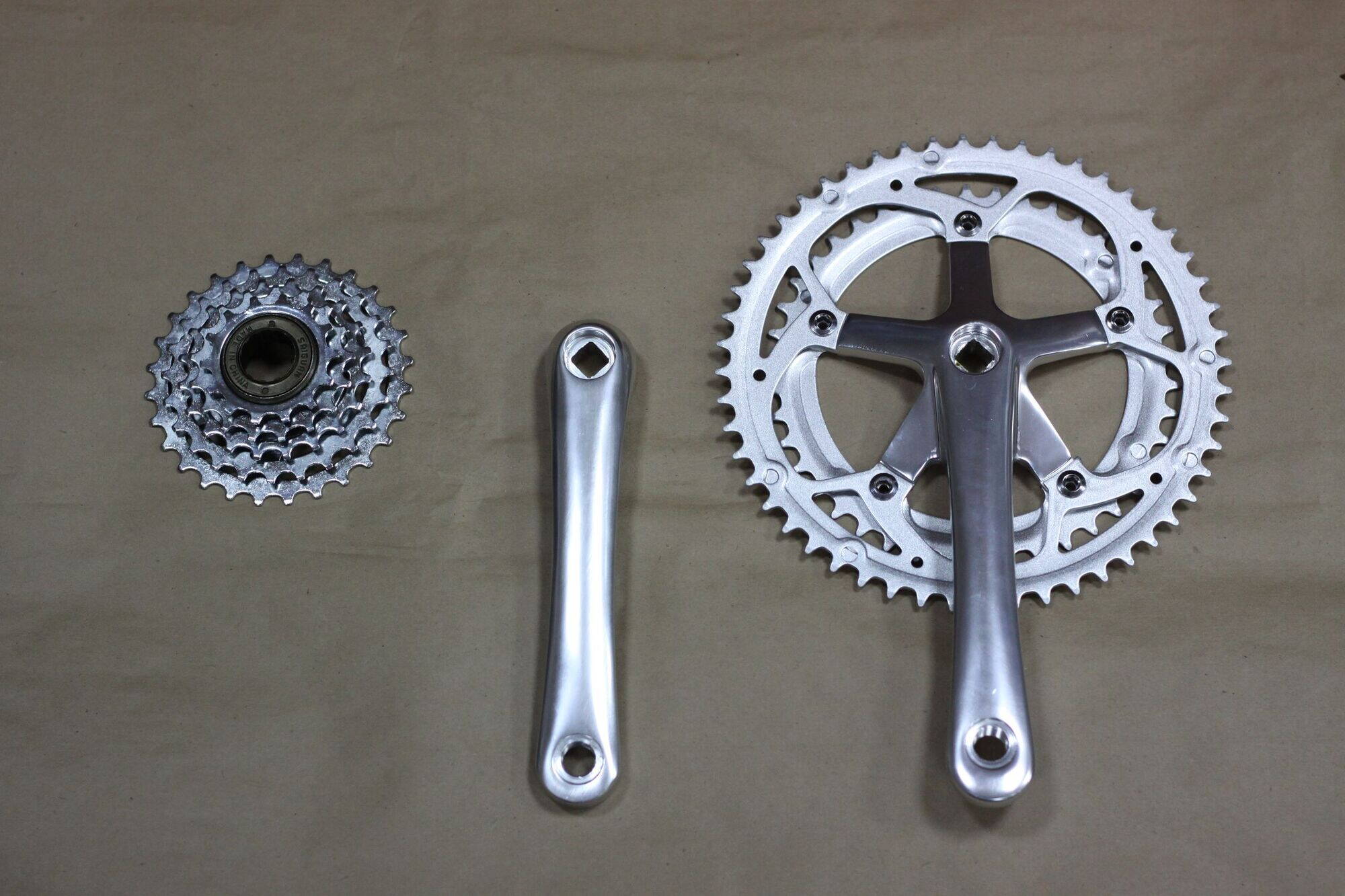 Начал собирать комплектующие, чтобы к весне быть во всеоружии))) Приобрел уже двойную систему (52-42), и пяти скоростную трещетку (14-28), передние переключатель попался по дешевке Shimano Sora правда хомут 34,9, но мир не без добрых людей и мне подарили переходник под наш размер 28,6)))