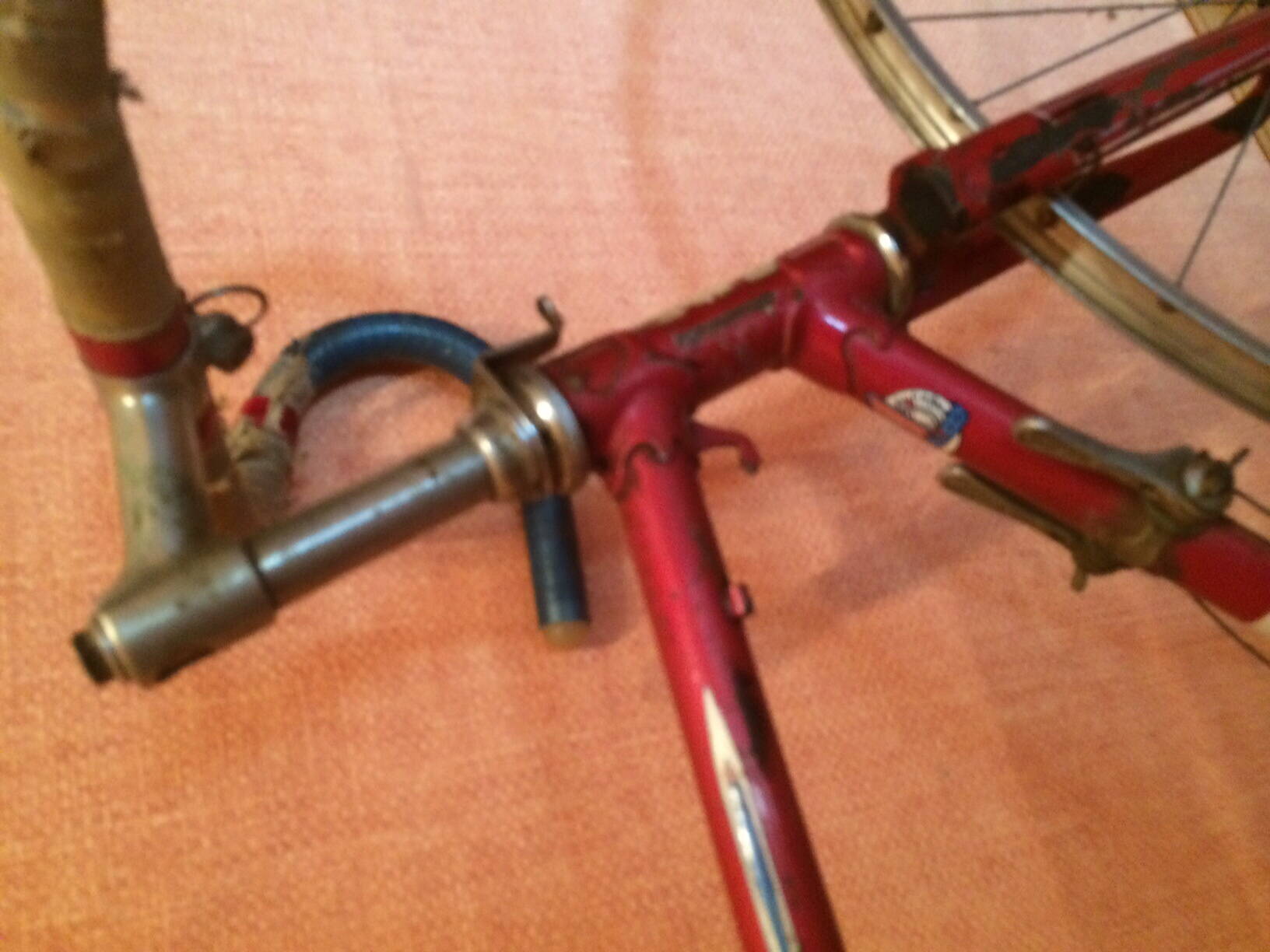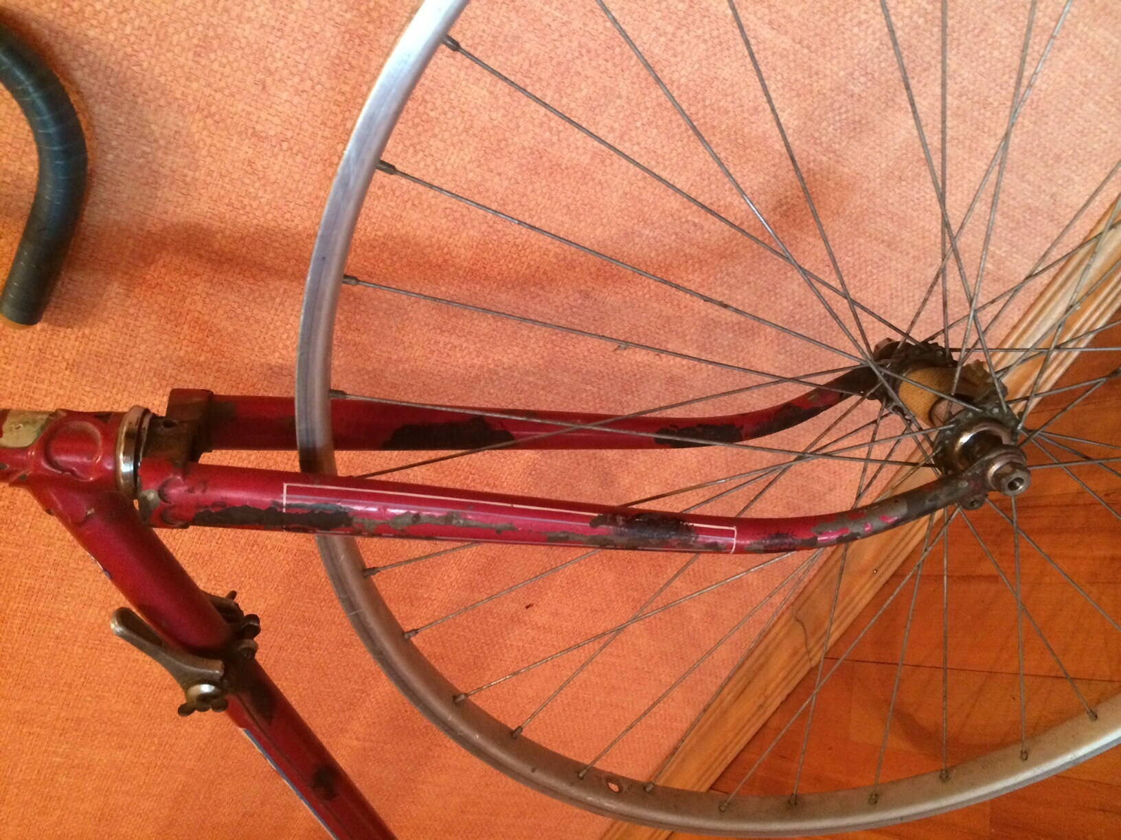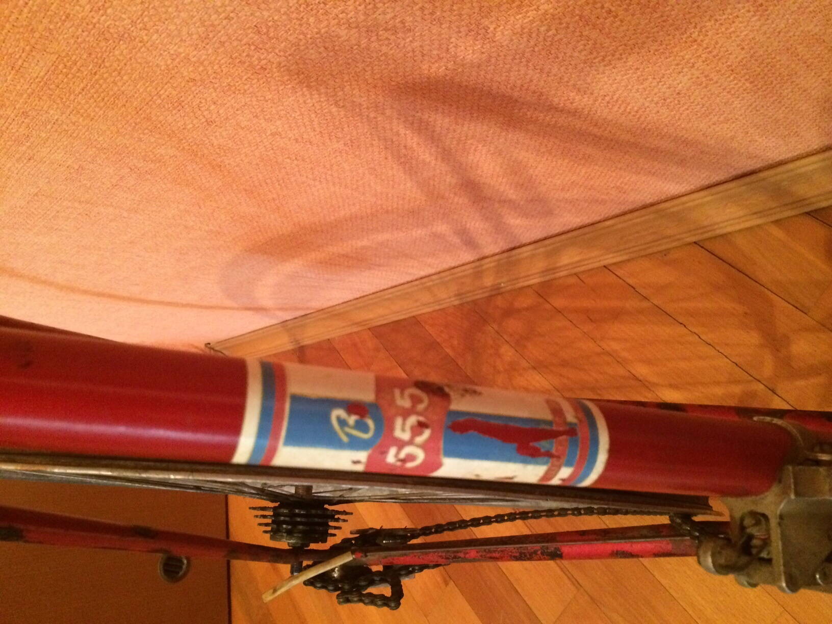 Ну вот, смотрим на раму, это Старт Шоссе 555 интересного года 1962 (на сколько я смог рассмотреть). ЛКП покоцано знатно и поверх отбитой краски закрашено кисточкой черной краской. Смотрим, думаем что делать, сохранять или не сохранять ЛКП. Колеса поставлены для макета, от туриста.
