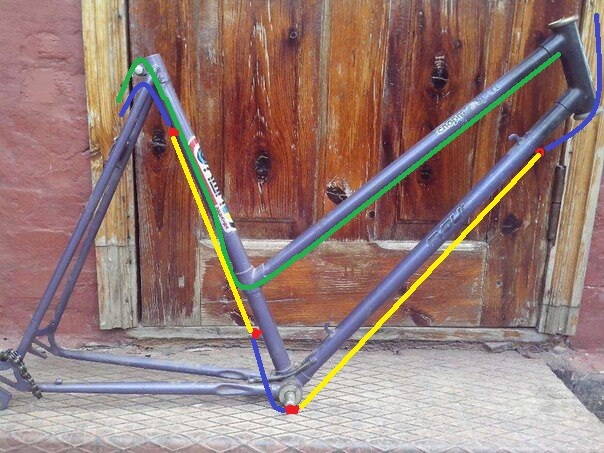 Всем привет! Ребята, помогите советом. Ситуация такая: есть вел хвз "Турист" на женской раме, все отлично ездит норм., но не могу нормально сделать задний тормоз, очень плохо тормозит, замена колодок и настройка тормоза не решают проблему, тормоз практически не тормозит. Грешу на "проводку" рубашки и тросика, сейчас тросик лежит в рубашке, которая сплошняком проложена от ручки к тормозу(зеленый цвет), до этого тросик был проложен через стандартные крепления (крепления- красные точки, желтый-голый тросик, синий-тросик в рубашке), но тормозил тоже плохо. Как проложить рубашки и тросик чтобы добиться нормального торможения? Тормоз стоит как на фото.