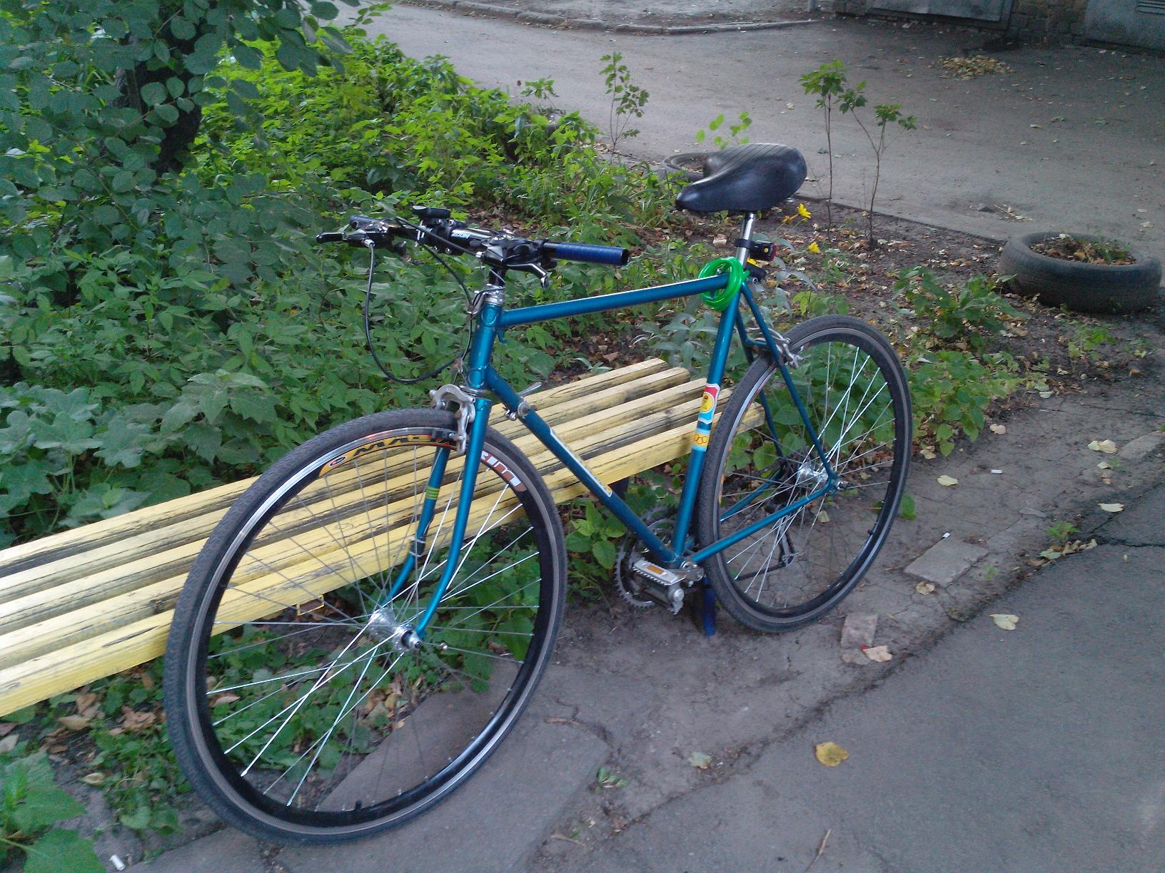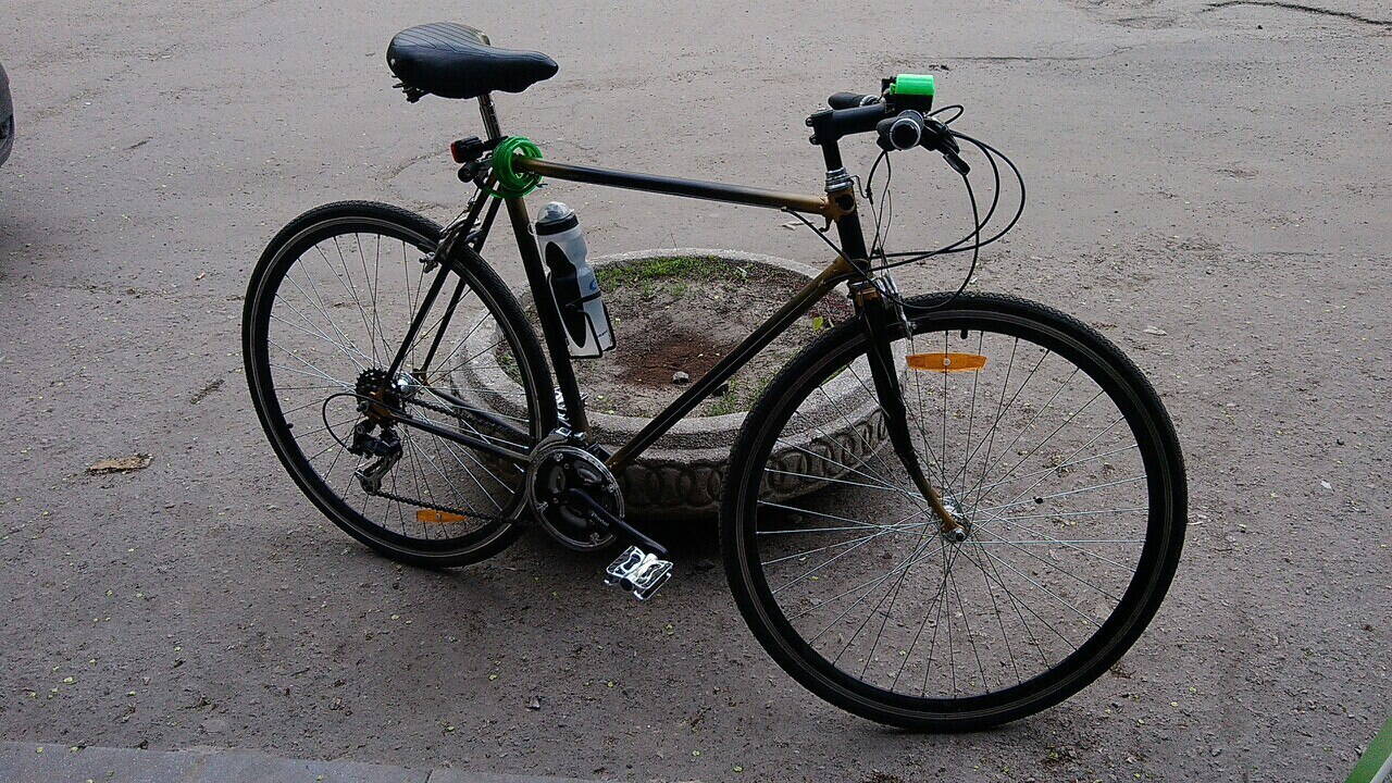 Теперь новые колеса, руль, задний переклюк , в планах каретка под квадрат , новые шатуны, заменить заднюю втулку под кассету, напаять бонки под рубашки манеток , гайки под держатель воды и собственно все!!!