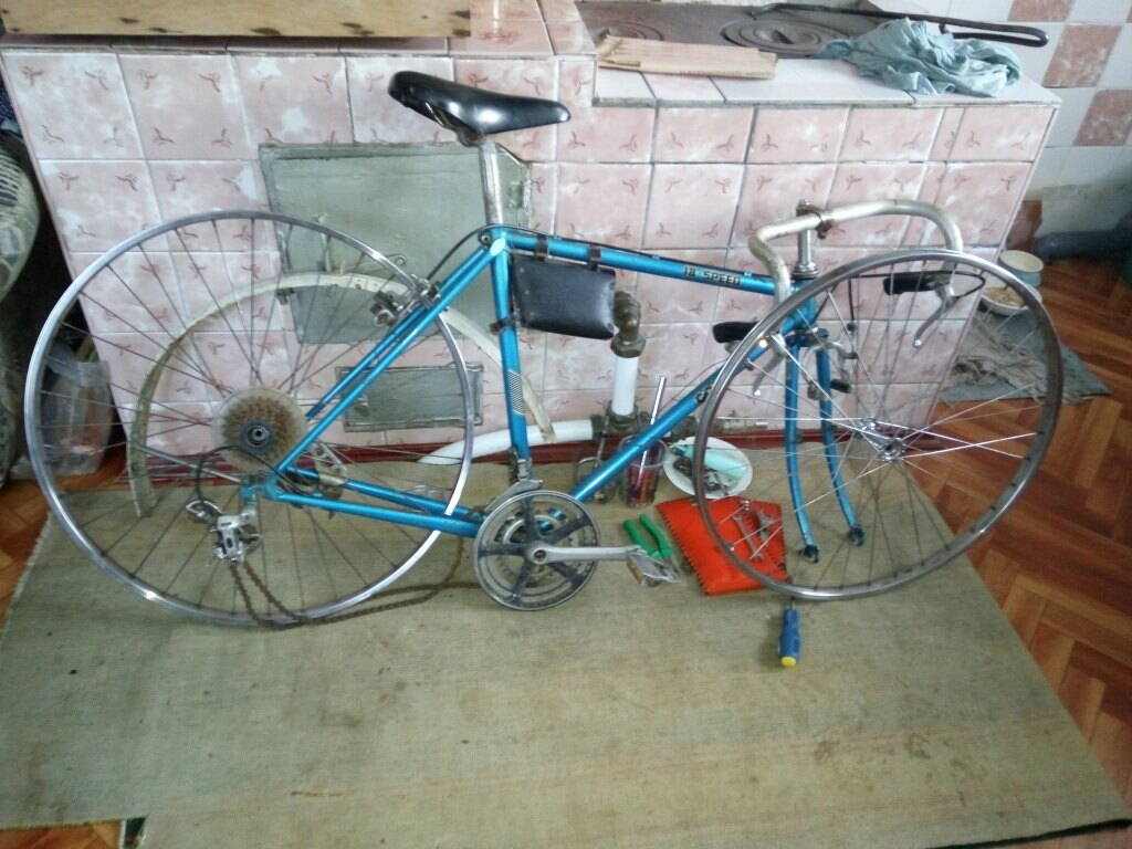 Об аутентичности этого аппарата поговорим чуть позже, когда я выложу фото. Сразу оговорюсь, что с учителем физкультуры у меня не все гладко получилось - когда я забирал велосипед, он был без колес и хозяин сказал, что поищет их соберет и отдаст мне их потом. Так потом и получилось, но с одним нюансом - колеса были без трубок и без осей и конусов, то есть обода заспицованные. После он мне много раз обещал перевернуть весь гараж и все-таки найти... но не получилось!