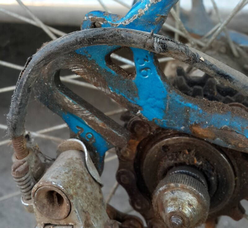 И вот недавно увидел на сайте объявлений за смешную цену велосипед - мечту. Спорт!!! Правда, картинки почему-то были очень мутными. Поехал, поглядел на него, чуть не заплакал: руля нет, вместо него прямая хромированная палка от какого-то мтб с одной грипсой и двумя мтб тормозными ручками. Из тормозов только половинка заднего (прежний хозяин так забавно им тормозил - подтягивая единственный оставшийся рычажок рукой), задний переклюк сломан (хрусь - пополам, пойду выпью), все тросы оборваны. Во всех узлах люфты. Решился взять. Пожалел и велосипед и парнишку, который его торговал. Заказал в областном центре для него тормозные ручки и переклюк. И вдруг коллега-друг, через которого заказывал говорит "у меня в деревне есть совеццкий спортивный вел, надо ли?" - это оказался СШ 79 г., олимпийской серии в состоянии гораздо лучшем, чем горемычный "спорт". Не без проблем - заржавела до негнущегося состояния цепь, оторвался трос переднего тормоза, передний переклюк сломан, седло без болта-натяжителя, колеса без трубок, рулевая припаяна со щелями.