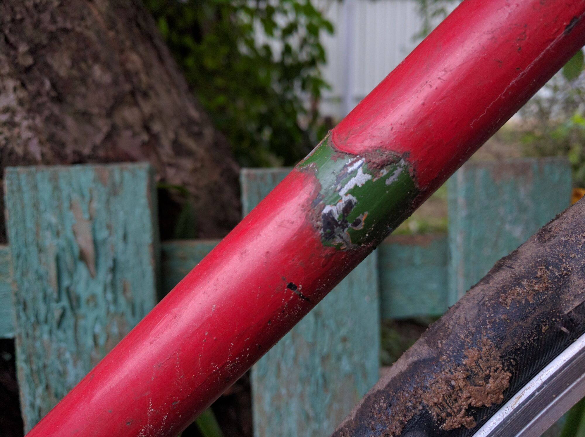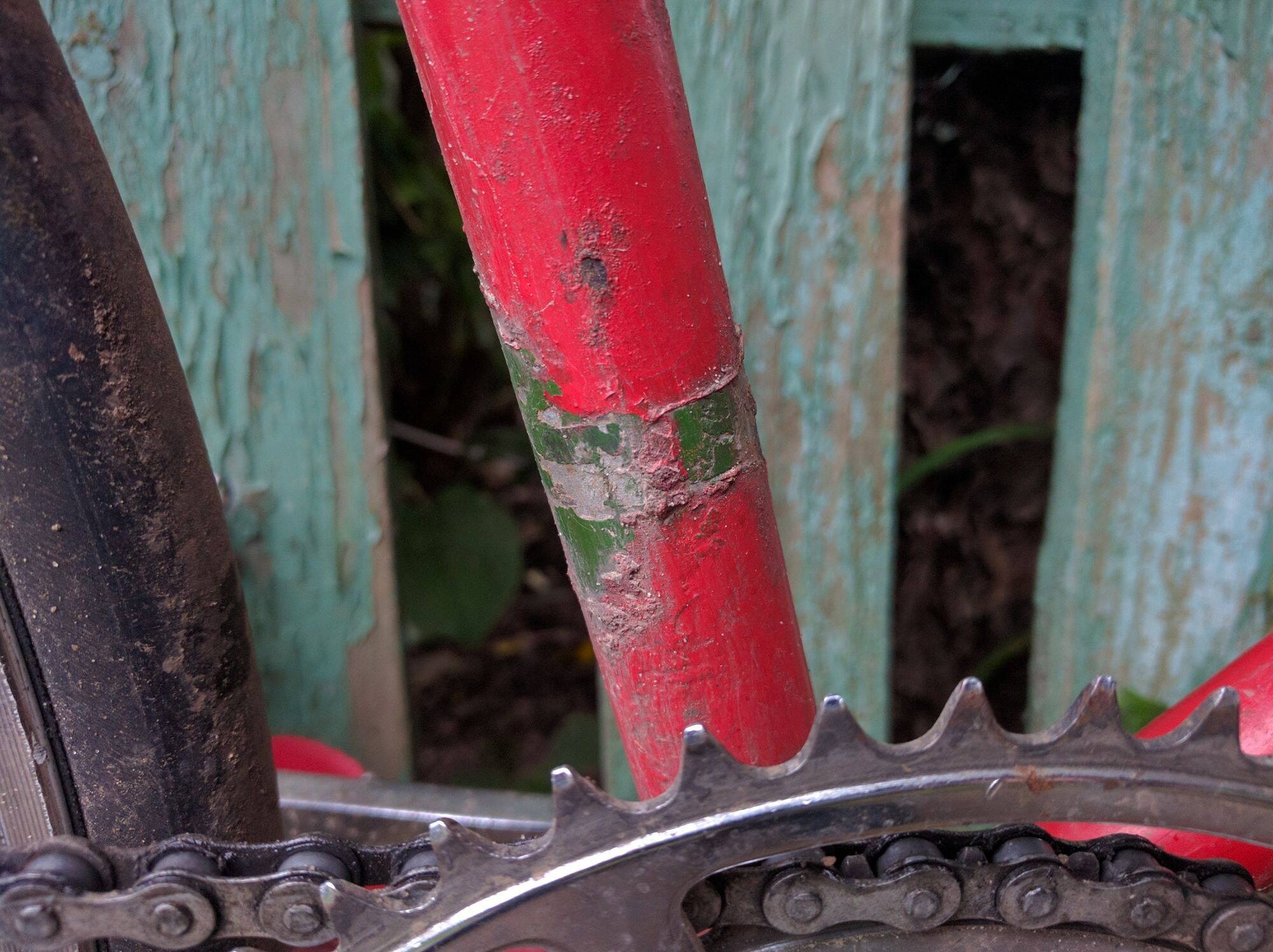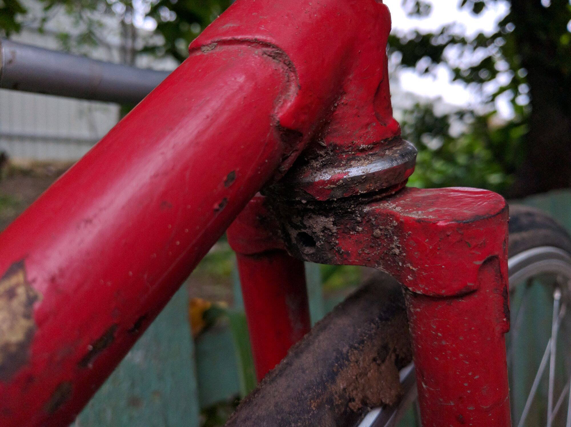 Велосипед, до того как он появился у меня, был у двух хозяев: деда с юга Московской области и молодого парня с Москвы. Парень пошёл правильным путём: поставил другие колёса, резину, туклипсы и снял то, что было лишнее. А вот дед был тот ещё затейник. Приварил + клёпки петух, просверлил дырки (на вилке криво) под тормоза, сделал упоры для тросика и всё это дело облил красной краской. В итоге мы имеем это ))