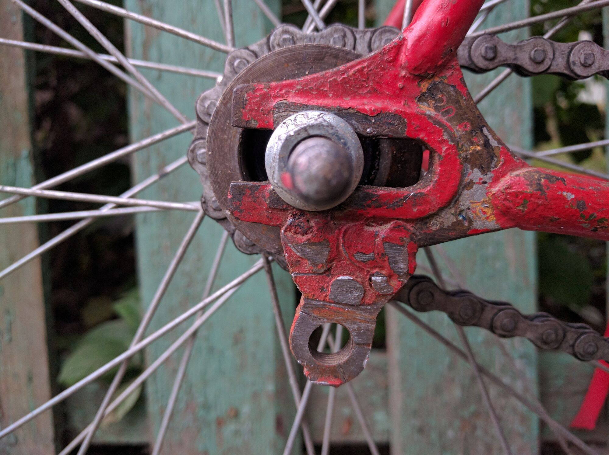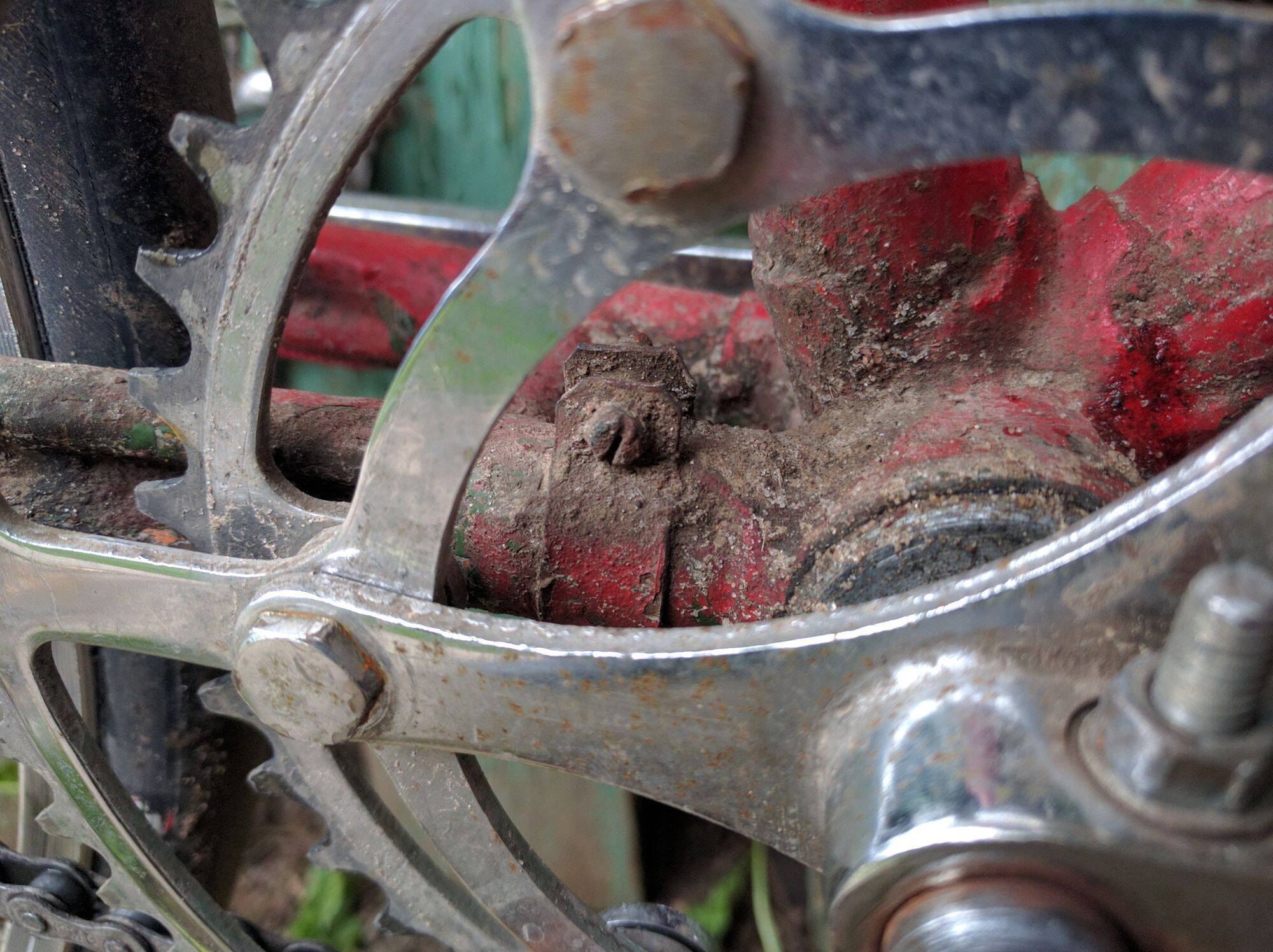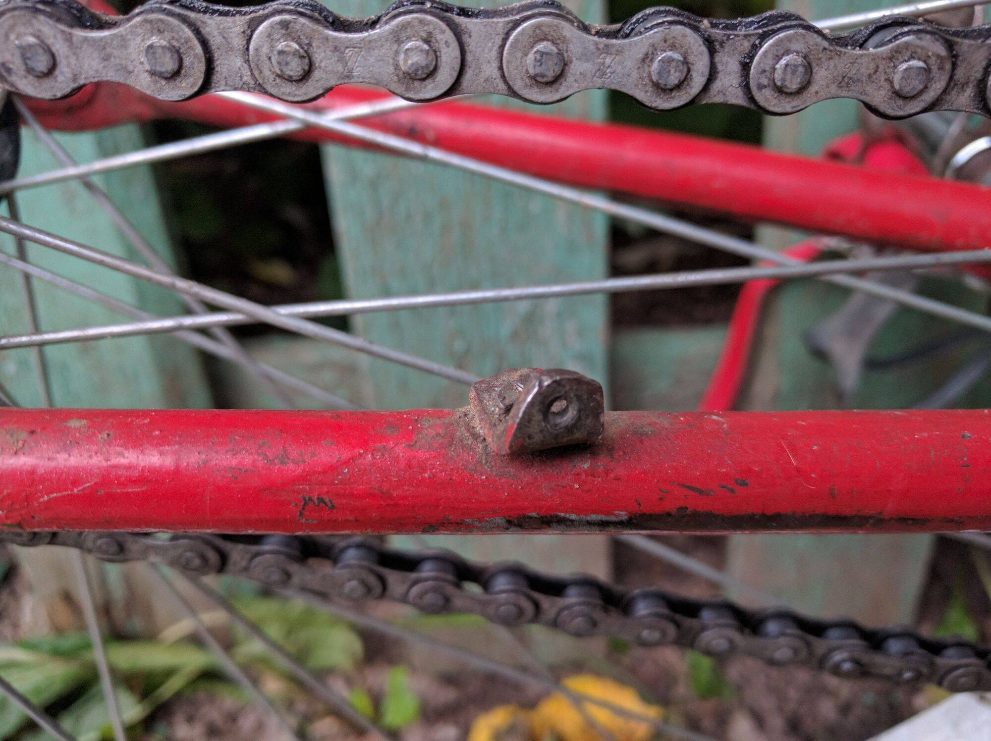 Велосипед, до того как он появился у меня, был у двух хозяев: деда с юга Московской области и молодого парня с Москвы. Парень пошёл правильным путём: поставил другие колёса, резину, туклипсы и снял то, что было лишнее. А вот дед был тот ещё затейник. Приварил + клёпки петух, просверлил дырки (на вилке криво) под тормоза, сделал упоры для тросика и всё это дело облил красной краской. В итоге мы имеем это ))