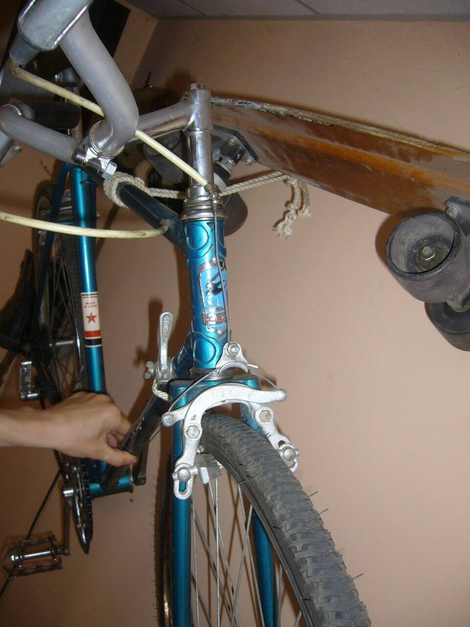 Первым этапом были заменены троса с рубашками, тормозные ручки, руль. В шатунах перерезана резьба на дюймовую и временно поставлены педали от моего прошлого вела. Отмыт слой литола с цепи и трансмиссии. В общем - приведён в ездящее состояние.