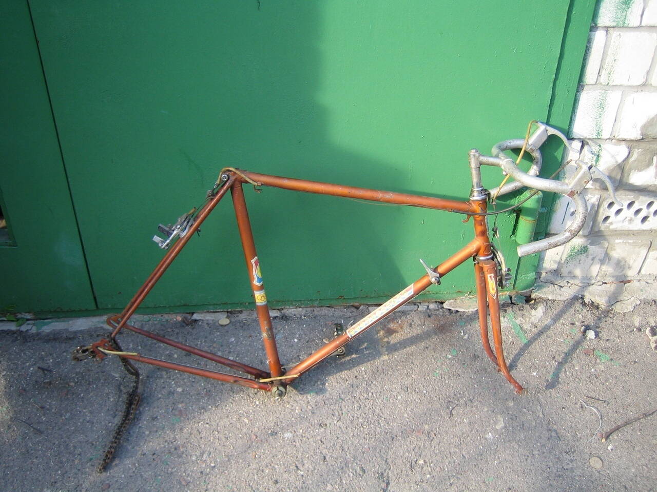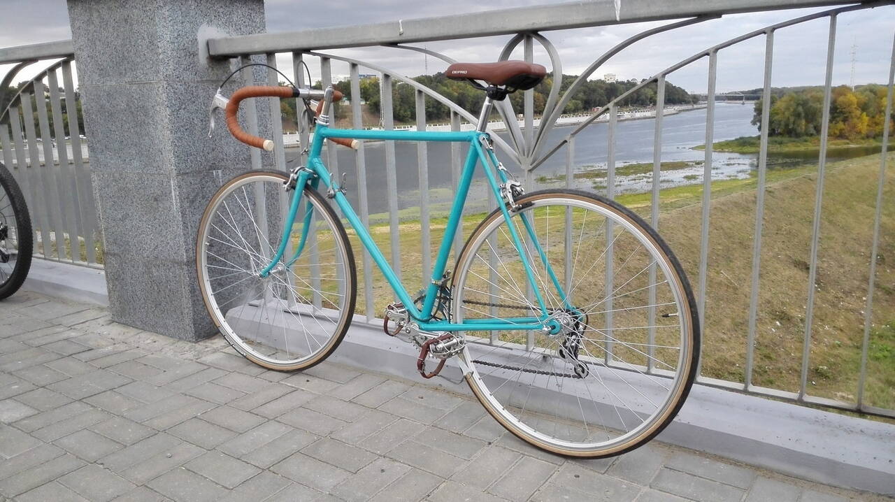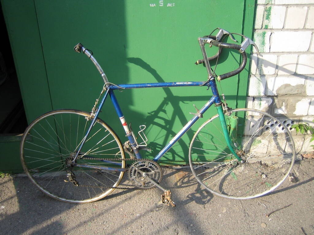 Началась история с того, что сосед - бывший велоспортсмен - собирался выбросить на помойку старый и, как ему думалось, ненужный велохлам, заниматься которым не было ни времени, ни желания. Но мой отец заботливой рукою смел железки в гараж до поры до времени - у хорошего хозяина все сгниет. Они лежали смирно несколько лет, пока в голове моей не зародилась мысль о создании своего вела. Поддавшись модным веяниям, я лелеял мысль о сингле с минимумом обвеса. Я уже мечтал о том, как буду резво красить его из баллончика, как вдруг подвернулась возможность покрасить раму на одном из еще существовавших тогда заводов, и, не долго думая, я выбрал одну из трех (да-да, дорогой читатель, подвалило так подвалило!) рам, которая показалась мне наиболее ровной и приличной, не задумываясь о сохранности родной видавшей виды краски, скоренько ободрал ее, зачистил и отдал на перекраску. Цвет не заказывал. Раму закинули в печь вместе с каким-то оборудованием, и на выходе я получил то, что мы с вами видим: светлое и прочное покрытие. Начитавшись статей о перерезке кареток и замене компонентов, подбивая неутишительный финансовый итог, я решил, все же, перебрать коробку с железками и определить, что можно оставить. И знаете, оттирая поржавевший хром и любуясь старым уже, но добротным механизмом, я пришел к выводу, что, пожалуй, соберу его полностью, на сколько это будет возможно, чтобы увидеть, как это было 30 лет назад, и что станет сейчас. Добротные вещи заслуживают уважения. Через пару месяцев я улыбнулся результату. И пускай он немного люфтит, и в каретке у него клинья, а не квадрат, и он ужасно непрактичен для городских бордюров, но старичок радует меня: он моложав, красив и резв; и, надеюсь, прослужит еще сорокет. Итак...