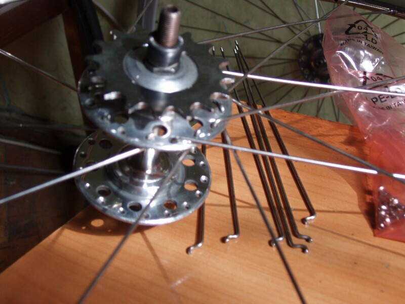 сломав несколько свёрл.. эээ..досверлил отверстия на теле втулки и забил туда пины от цепи. Если повторять конструкцию сейчас, я бы сделал одну шпонку, причём резьбовую. То, что звезда несъёмная (без болгарки), меня не парит. Т. к. нужного размера спиц не оказалось, пришлось покупать более длинные и откусывать головки, гнуть концы - всё видно на фотках.