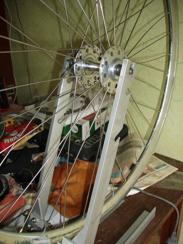 Колёса получились очень жёсткими. Одна из спиц с гнутыми концами после 500 км таки репнула. Видимо, чего-то перегнул. После этого собственно и спаял проволочками задние правые спицы. Вся эта конструкция выдержала ещё одно суровое испытание - боковой удар, от которого одна из передних спиц вырвалась из головки. Ободу и втулке - хоть бы хны, хотя радиальная спицовка предъявляет повышеные требования к их прочности. Ещё один плюс ХВЗ-шной втулке. От нервов я эту спицу выкинул сдуру, а заменил временно (уже 500 км