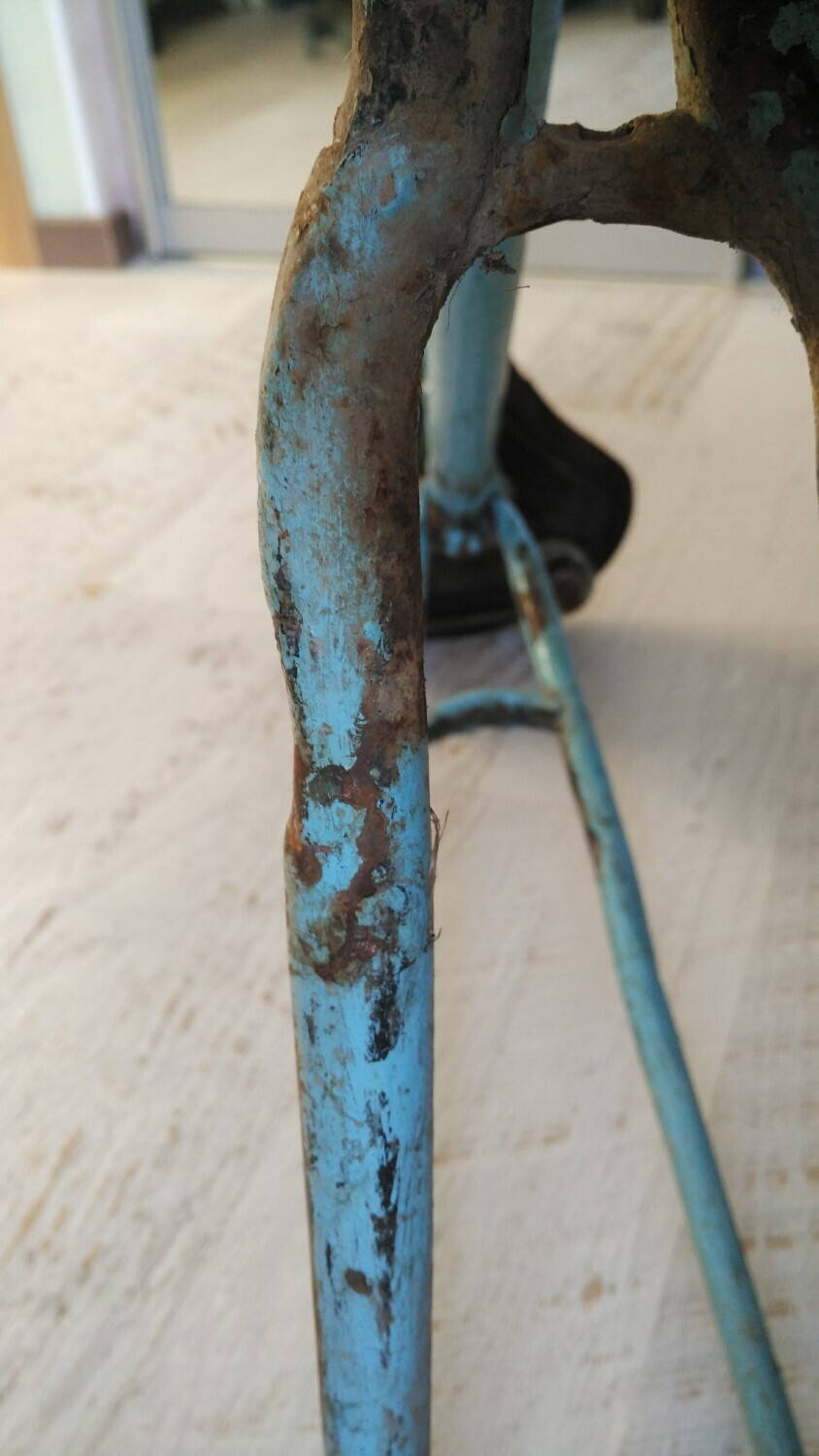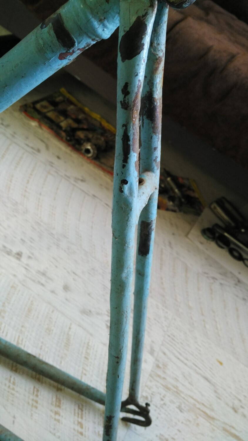 При разборке выяснилось, что рама, обода и крылья покрашены кисточкой. Рама и задний обод (чайка крашеная, с красными цировками) видимо от ЖВЗ Прогресс. Вилка и передний обод (не чайка, но тоже крашеный, с цировками) от зеленой Десны.