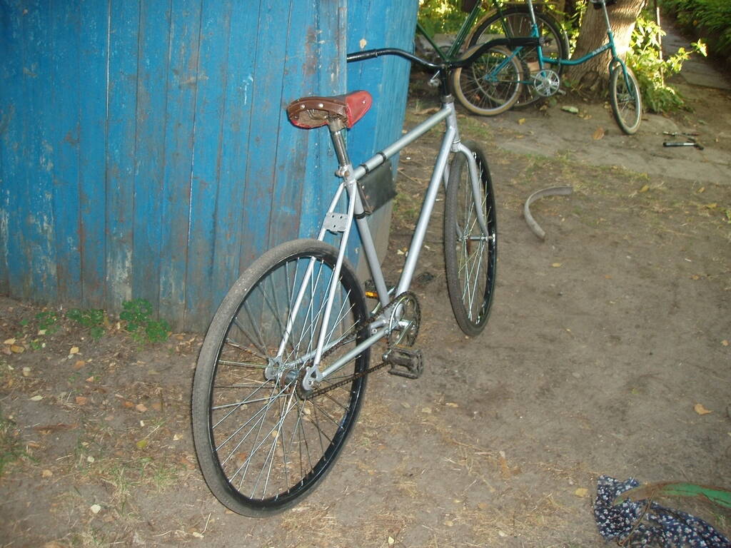Крепенький алкобайк для друга. Ещё он иногда с дачи на работу на нём ездит. Валялся на берегу в рыбацкой хижине (в половодье воды по колено) у другого друга страшно поржавевший вел очень сборного характера. Например, рама 90-х годов, колесо, где на задней втулке надпись "Харьков" и маслёнка, странная система - зубов на 40 но с длинными шатунами и т.д. Это было конфисковано и разбарахолено.