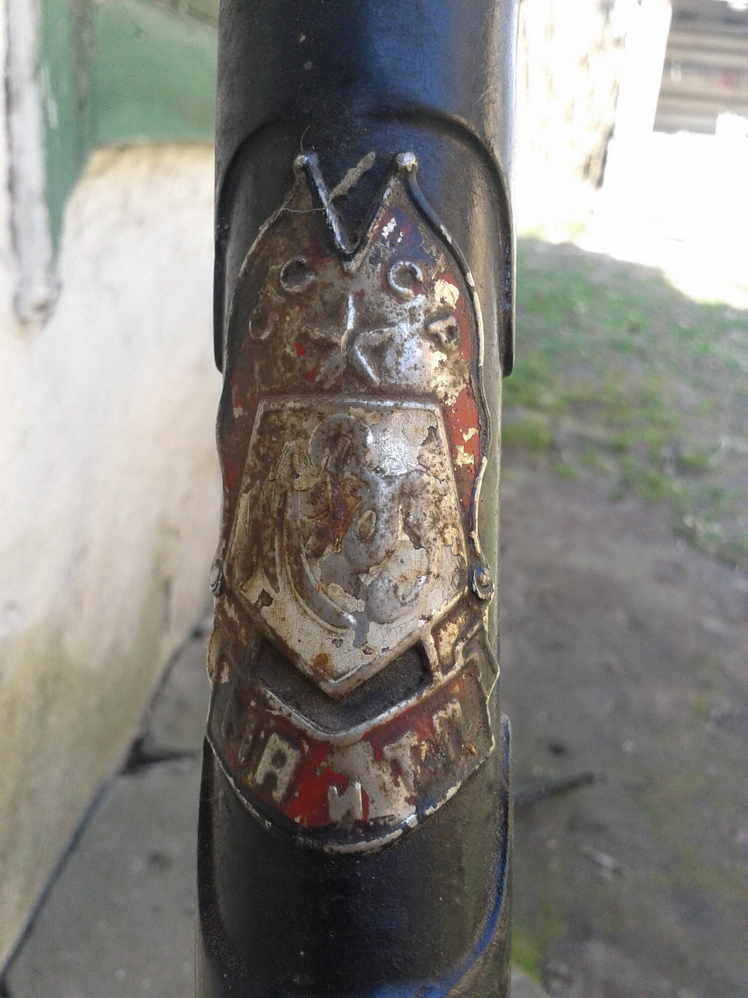 Эмблема на раме МВЗ, год выпуска то ли 55 то ли 59, не разобрать. рама достаточно легкая, немного погнутая верхняя труба рамы ( слегка посередине- исправимо). пока что больше ничего сказать не могу.