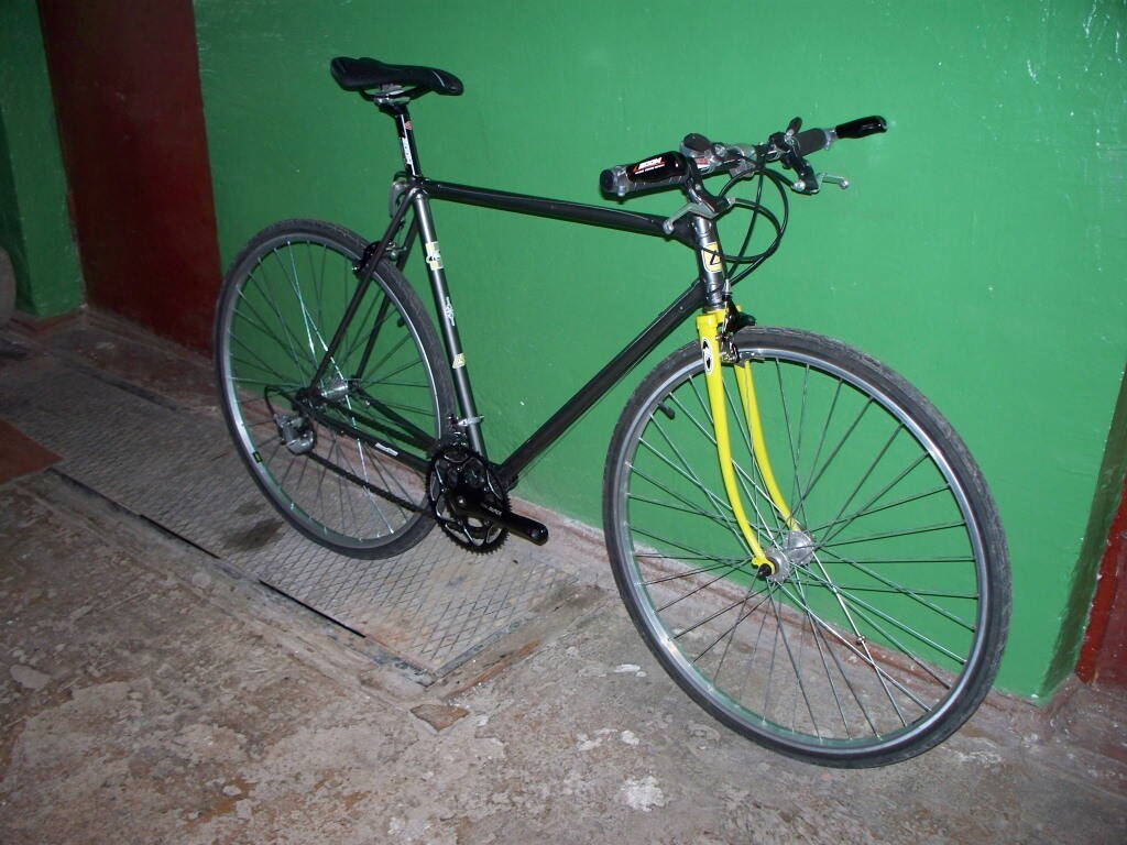 Жёлтая вилка это издержки жлобства! Изначально хотел весь жёлтй. Покрасил вилку, легло восемь слоёв пока удовлетворил результат. А оттенок не нравится. Еду на рынок и беру серый металик, крашу раму. Цвет очень нравится. Но на вилку не хватило. Вот результат, ещё балон дорогого металика для вилки жаба задавила.