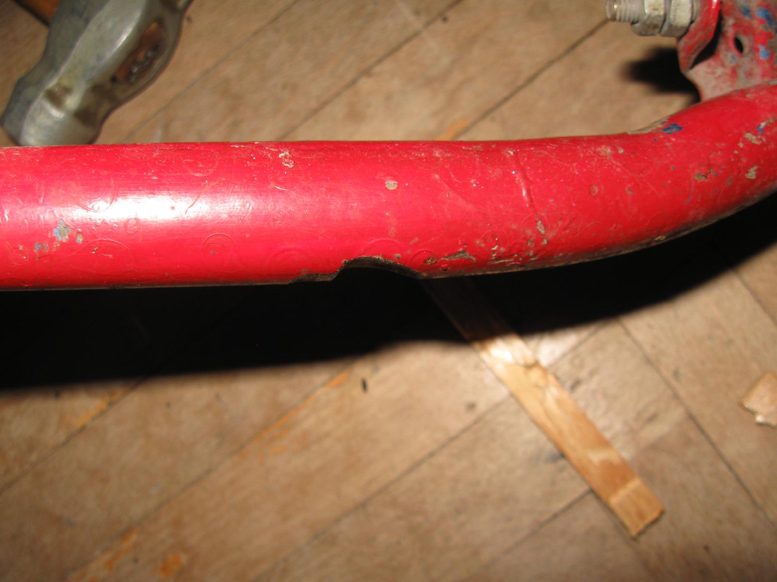 Решил посмотреть на раму своего детского велосипеда - складного Аиста на 20'' колесах. В результате воздействия на перо рамы кривого шатуна была образована вмятина. До дырки вроде не протерло. Насколько это критично? Что с этим можно поделать?