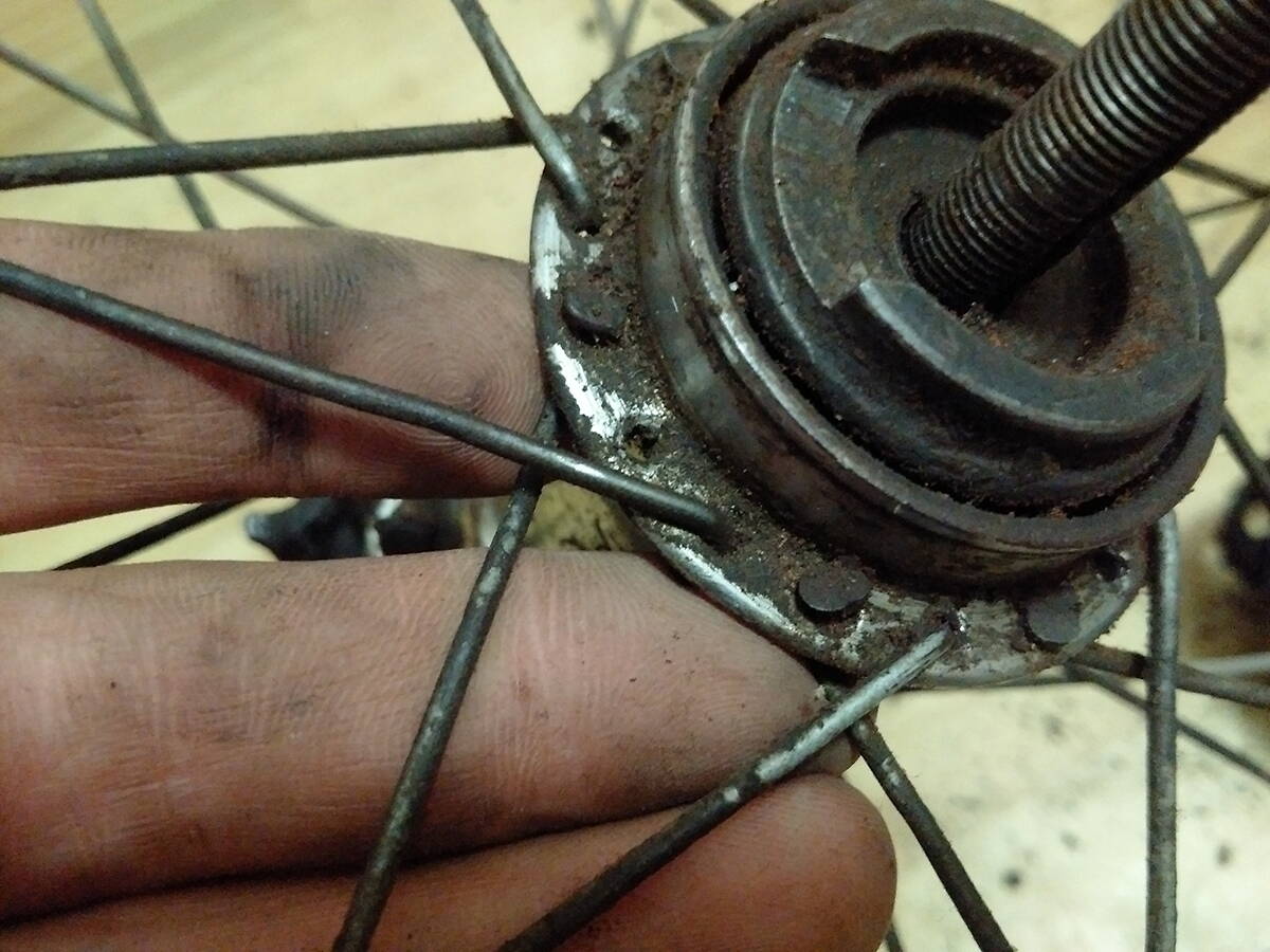 Во-первых, выяснилось, что на фланцах задней и передней втулок по 36 отверстий, а обода рассчитаны на 28 спиц. Соответственно, при попытках совместить (заспицевать такие обода на таких втулках) автору пришлось пропустить некоторые отверстия на фланцах. Хитро! Смело! Креативно! Делаю вывод, что такое кулибинство есть продукт поздних наслоений на аутентичный объект. Поэтому напрашивается предположение, что неродными являются или втулки, или обода велосипеда. Или вообще, ни то, ни другое.