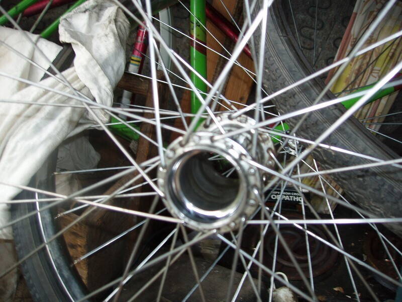 На подопытном Аисте, кроме всего прочего (неправильные пересечения и фабричный набор) половина спиц ещё грустно выглядели из-за ржавчины, и на одном колесе была изрядная большая и плавная восьмёрка, поэтому принято решение колёса переспицевать. На одно колесо набралось восстановленых спиц (на дорожниках при наборе два креста спереди - три сзади, длина спиц может быть одинакова), на другое купил на рынке новые.