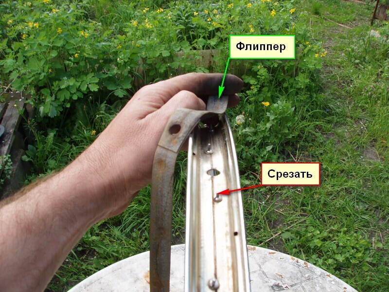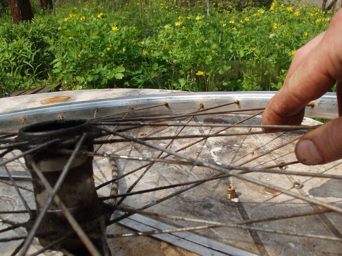 После этих операций обязательно контролируем (при одинарном ободе), чтобы из ниппелей не торчали спицы внутрь обода! Лишнее я стачиваю болгаркой.
