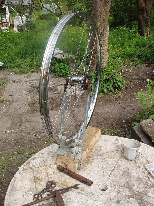 Настройку можно производить прямо в вилках велосипеда (описывается в статье Ш. Брауна в конце), можно соорудить приличный станок, можно - примитивный, вроде моего дачного.