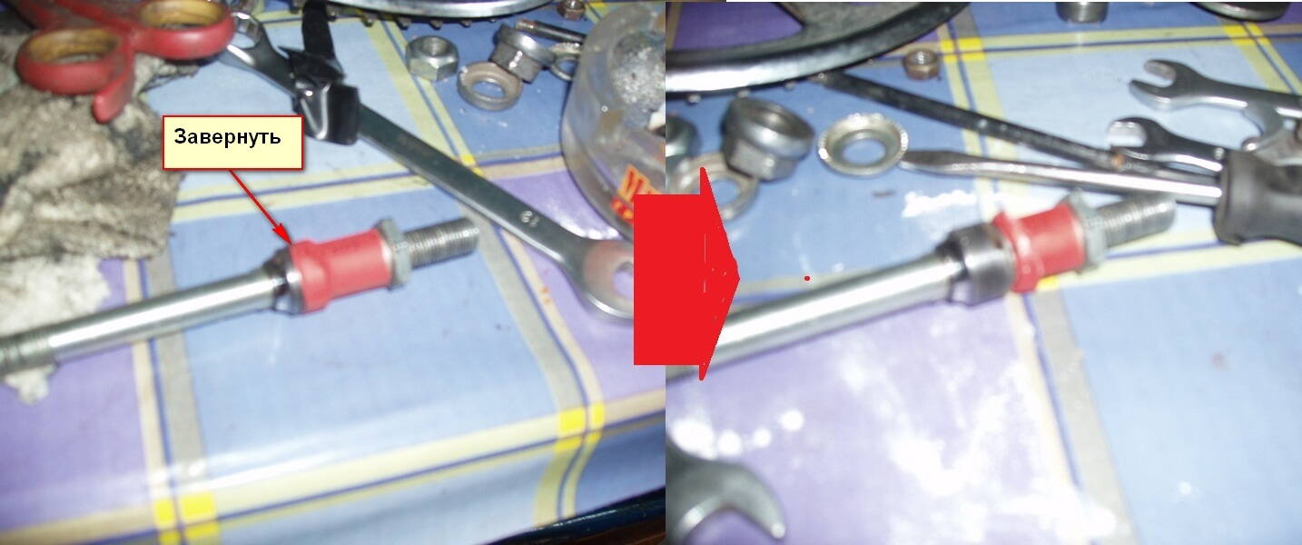Надеюсь, с установкой колёс на велосипед проблем не возникнет. Хочу напомнить разве что, что при наличии ободных тормозов (клещей, ви-брейков) накачаная шина может не проходить между колодками. Поэтому колодки нужно распустить - сбросить поперечный трос на классических клещах ХВЗ, откинуть специальный рычажок на клещах с боковой тягой, сбросить конец рубашки троса с рычага ви-брейка.