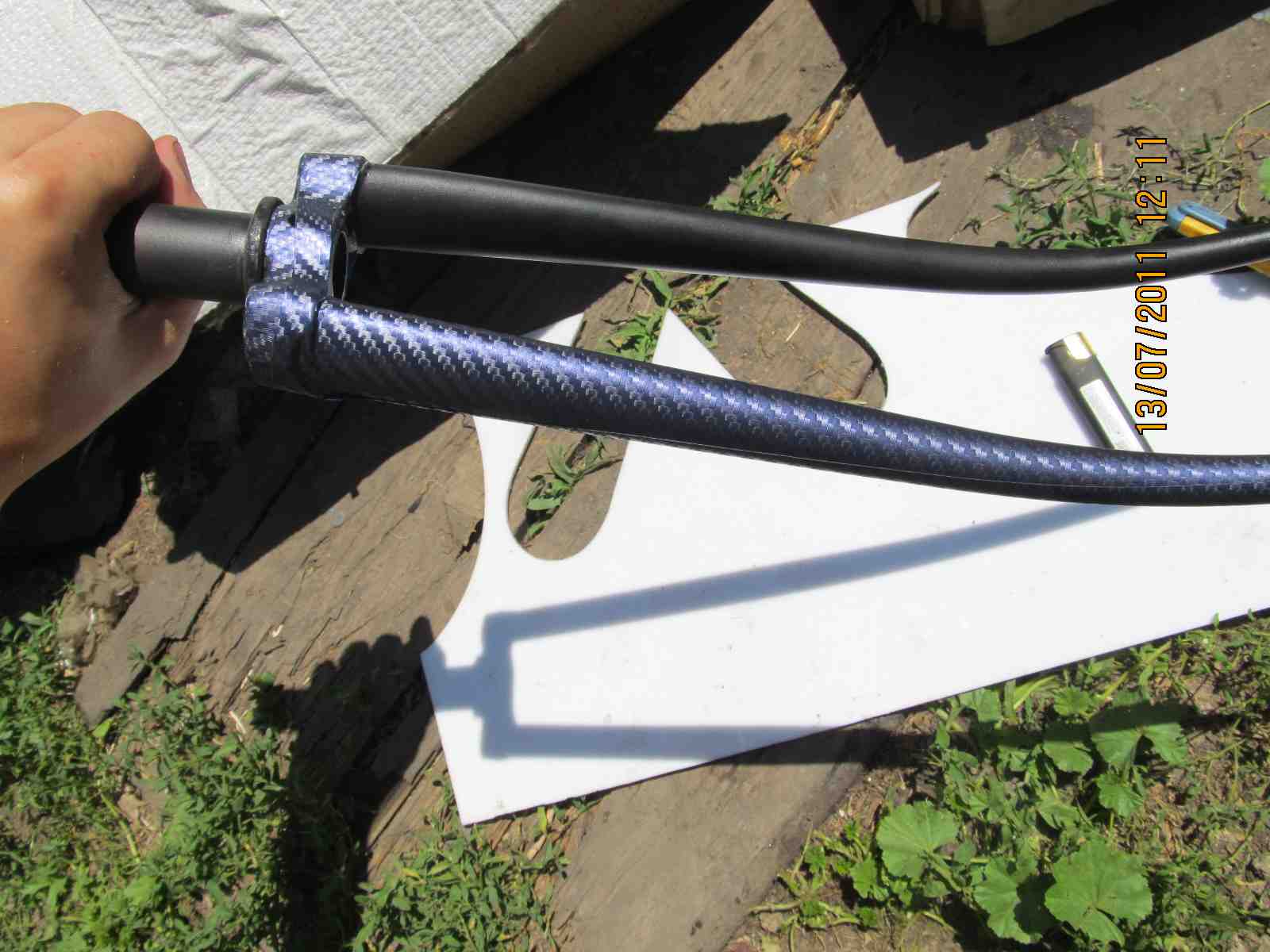 По советам решил переклеить вилку в синий карбон,в роде как нормально получилось,вел еще не собирал,как назло сорвалась резьба на петухе,потом решим.Ну вот собственно процесс:тут всё понятно,ничего сложного нет,главное чтобы были руки,материал,который я использывал-это пленка под карбон,синяя maxplus (http://www.youtube.com/watch?v=-4u8lNaXav4)китайского производства,она намного толще чем бельгийский 3D карбон,тянется хуже,покупалась здесь http://www.promdesign.ua/autostyling/ma ... nki/carbon),10х150см, мой инструмент-это нож,зажигалка,клей и еще солнце помогало прогревать пленку и вилку.Начал с того что вырезал шаблон по вилке с листа бумаги(индивидуально к каждой вилке),потом перенес его на обратную сторону пленки,наметил и отрезал,надо отрезать с запасом .Потом отрываю подложку с пленки прикладываю к вилке с фронтона и постепенно обжимаю рукой,выдавливая воздух,при помощи зажигалки растягиваю пленку на узлах,клеем проклеиваю стыки