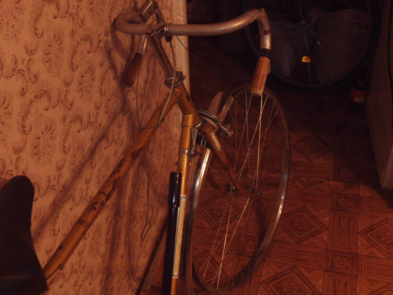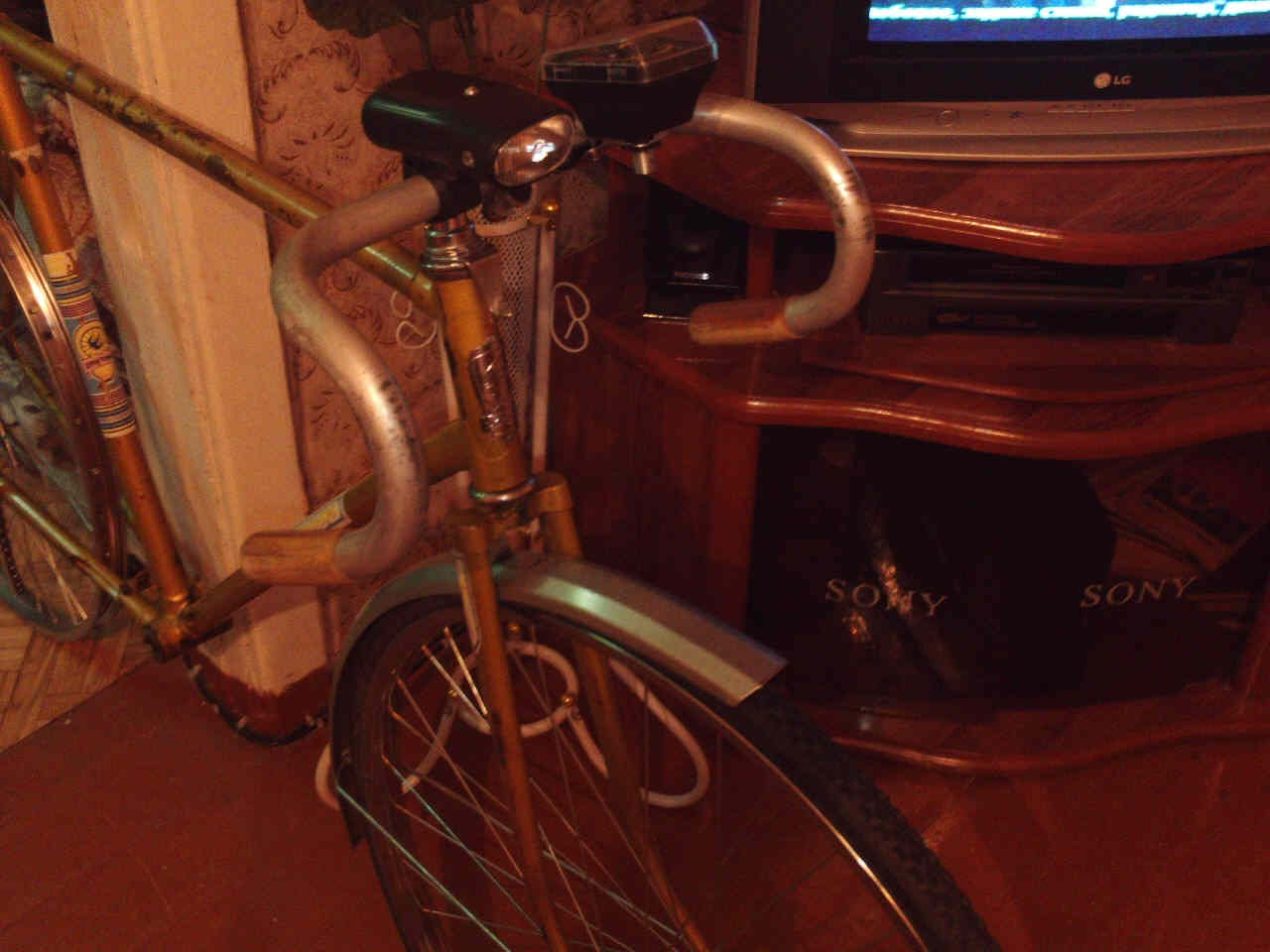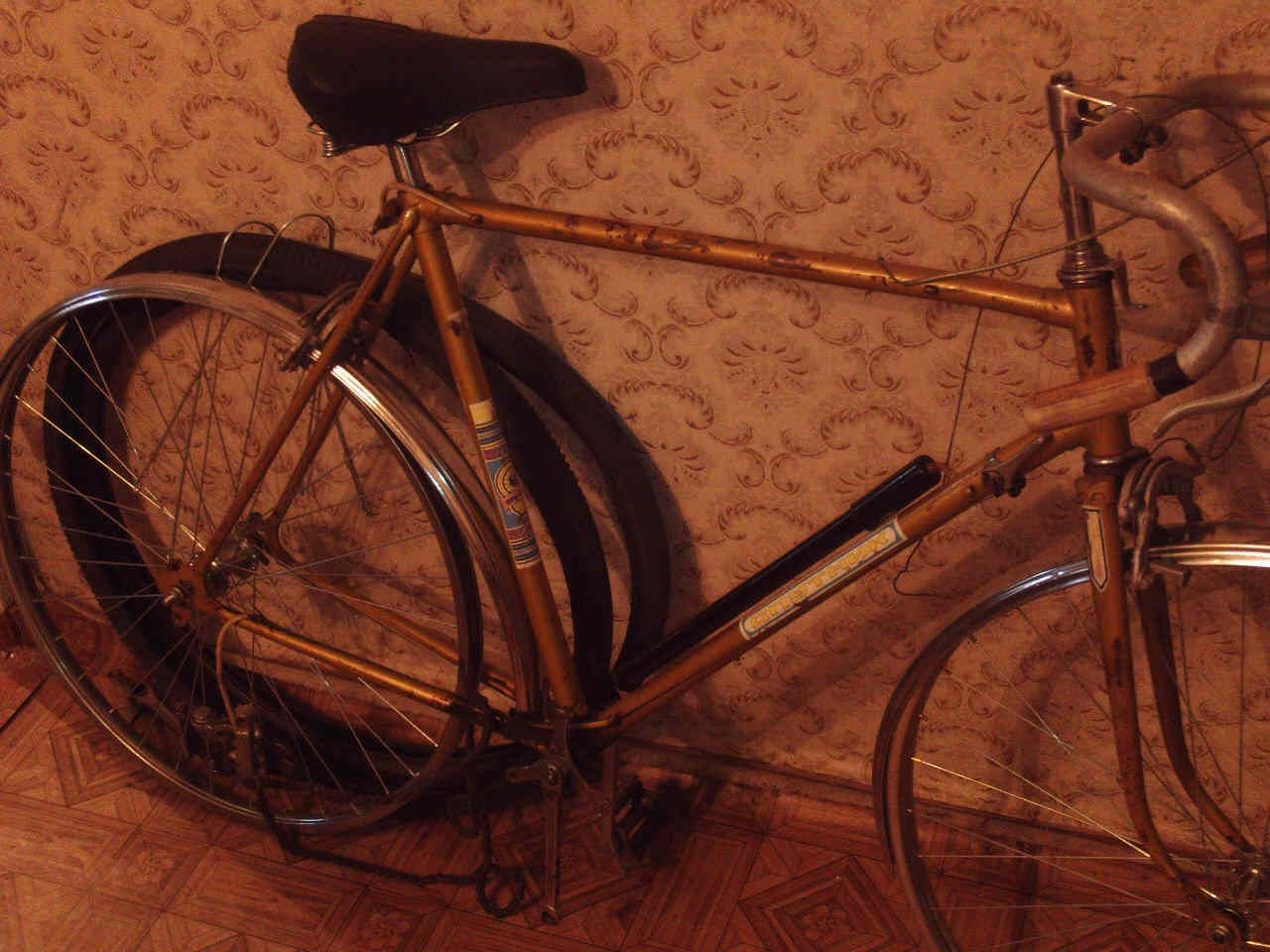 Первый этап: установлено переднее колесо фирмы ''Suzue'' (Япония, судя по гравировке на втулке) с одинарным ободом, камера и покрышка фирмы ''Street Trax'' (пр-во Германия, 80-х годов выпуска, отличного качества), новое переднее крыло от ''Украины'' 2009-го года выпуска...