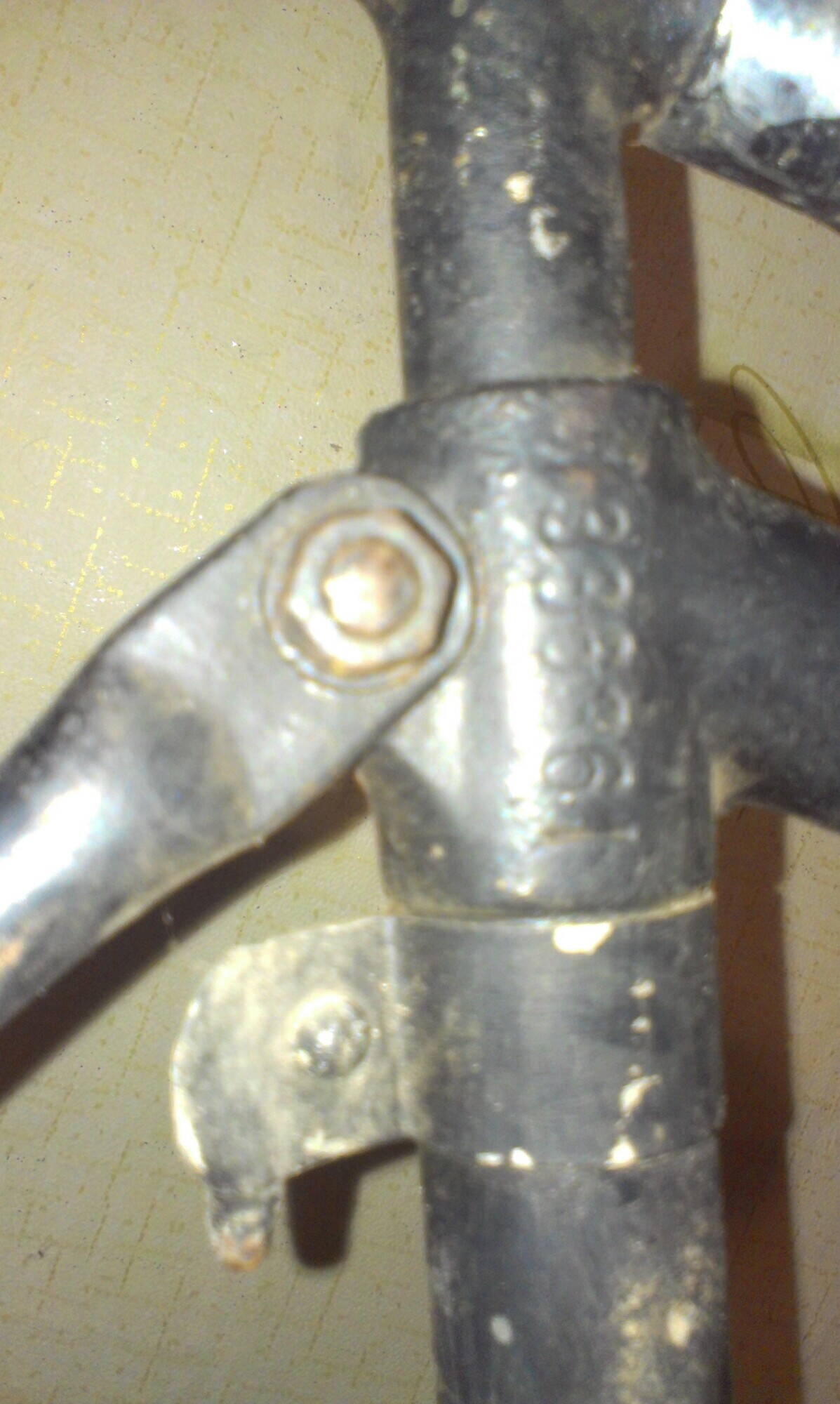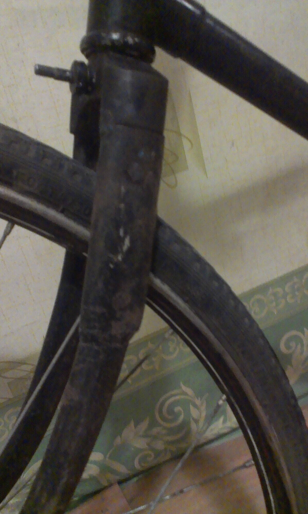 Вилка гнутая. На это намекает не только ее ремонт (Das Repartur!), но и то, что нынешнем виде рама приобрела слопинг в обратную сторону. В оригинале, скорее всего, вилка намного прямее. Ну а так все круто, настоящий арийский велик, и если бы маленький орленок на втулке был больше, то производители обязателно гордо вставили бы свастику в то колесико :D
