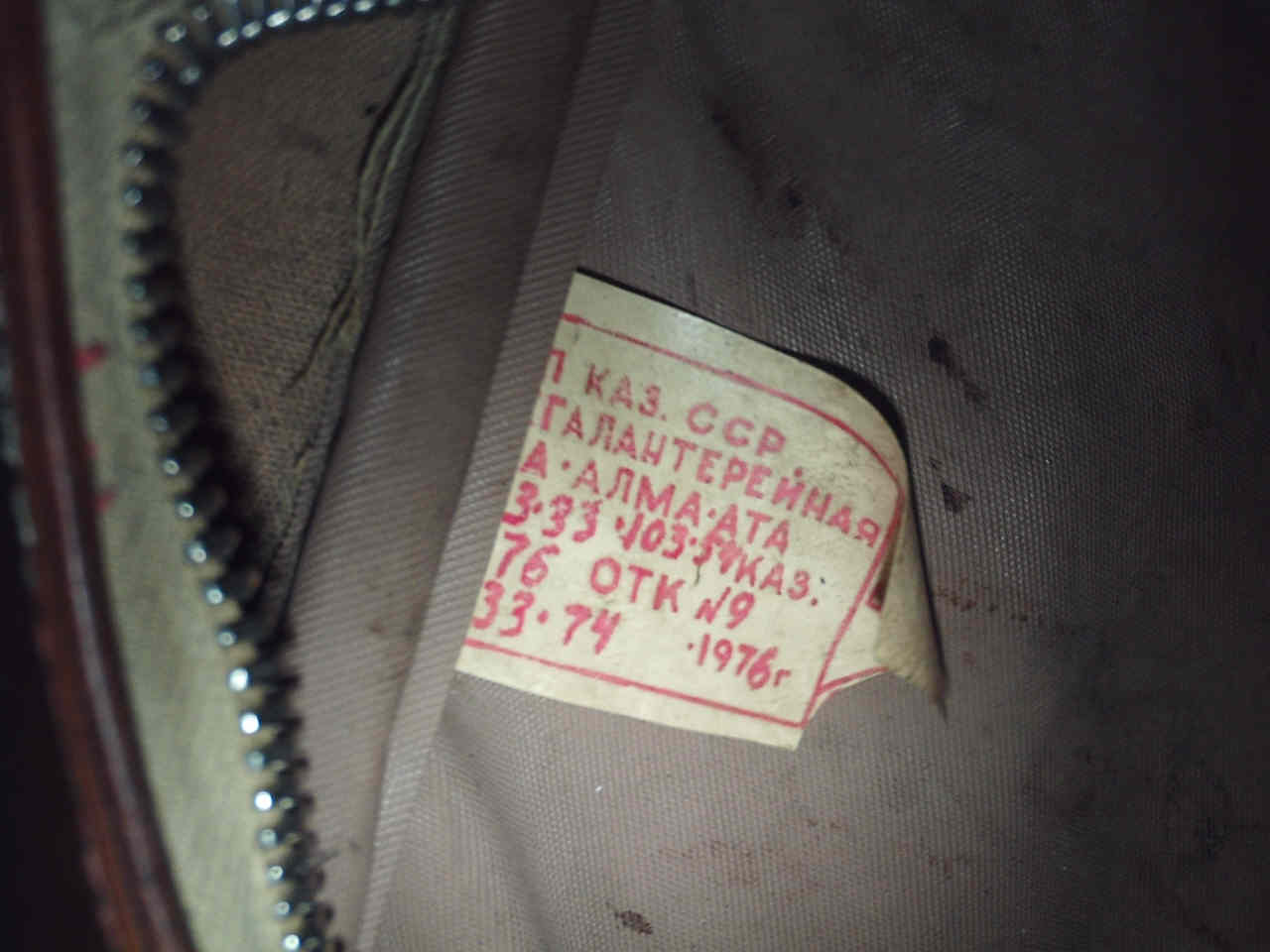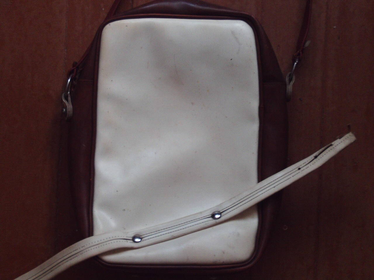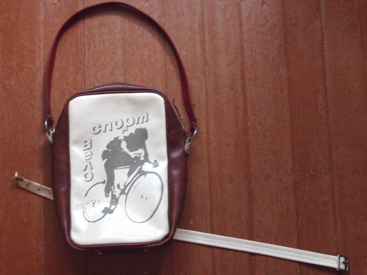 Изделие изготовлено из кожзама. Верхний ремень не заводской, родной уже давным-давно порвался, но он был регулируемым. По цвету он был тёмно-коричневым как и торцевая часть сумки.