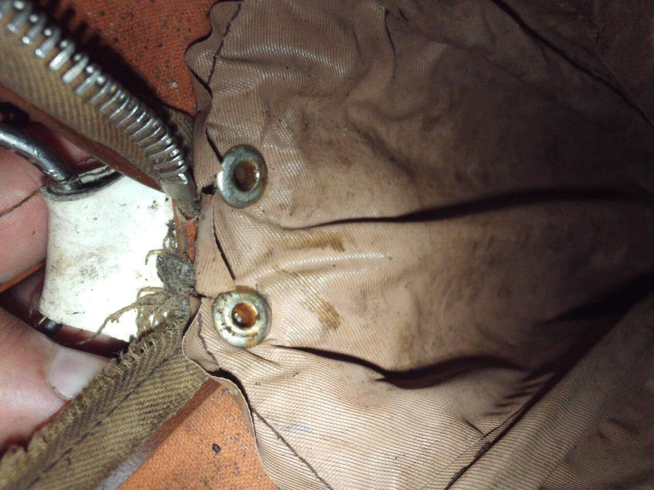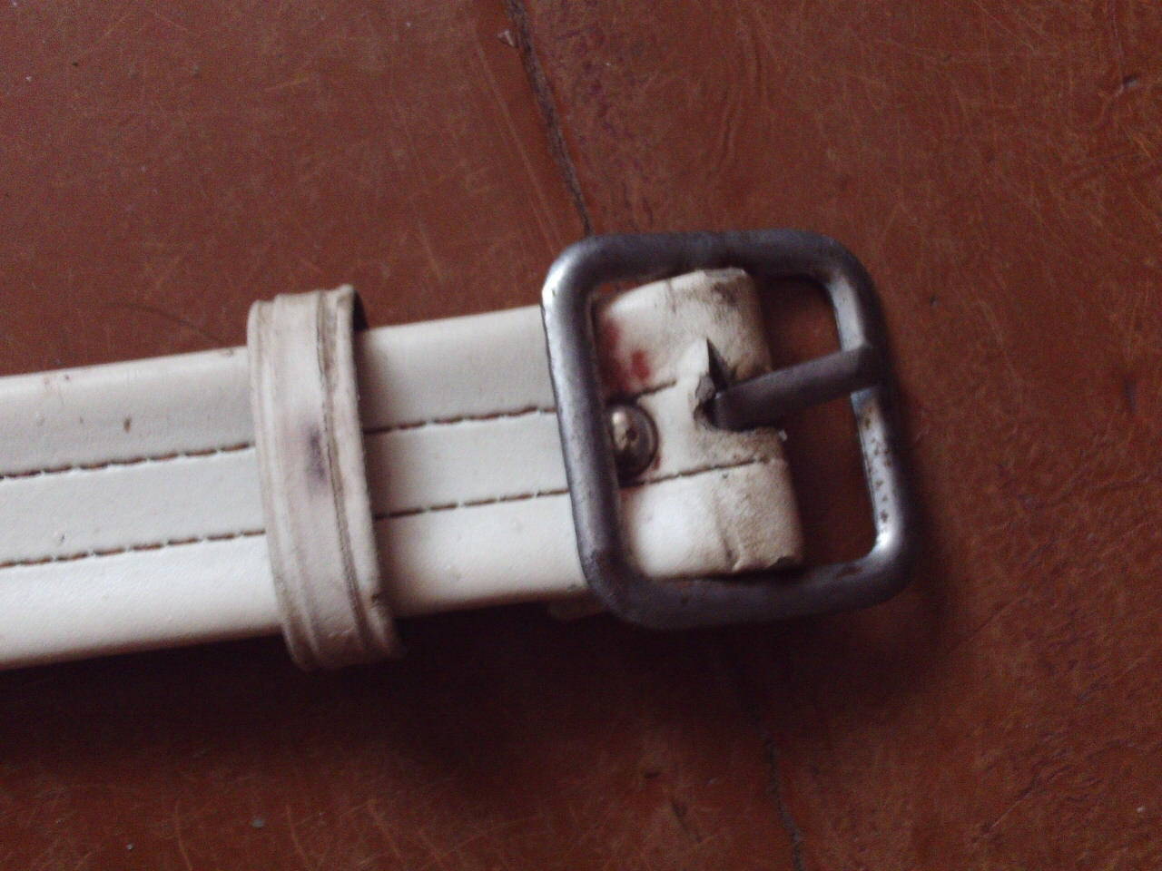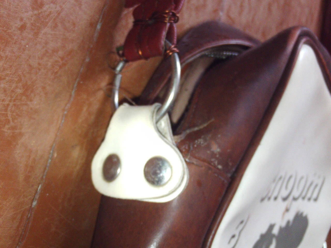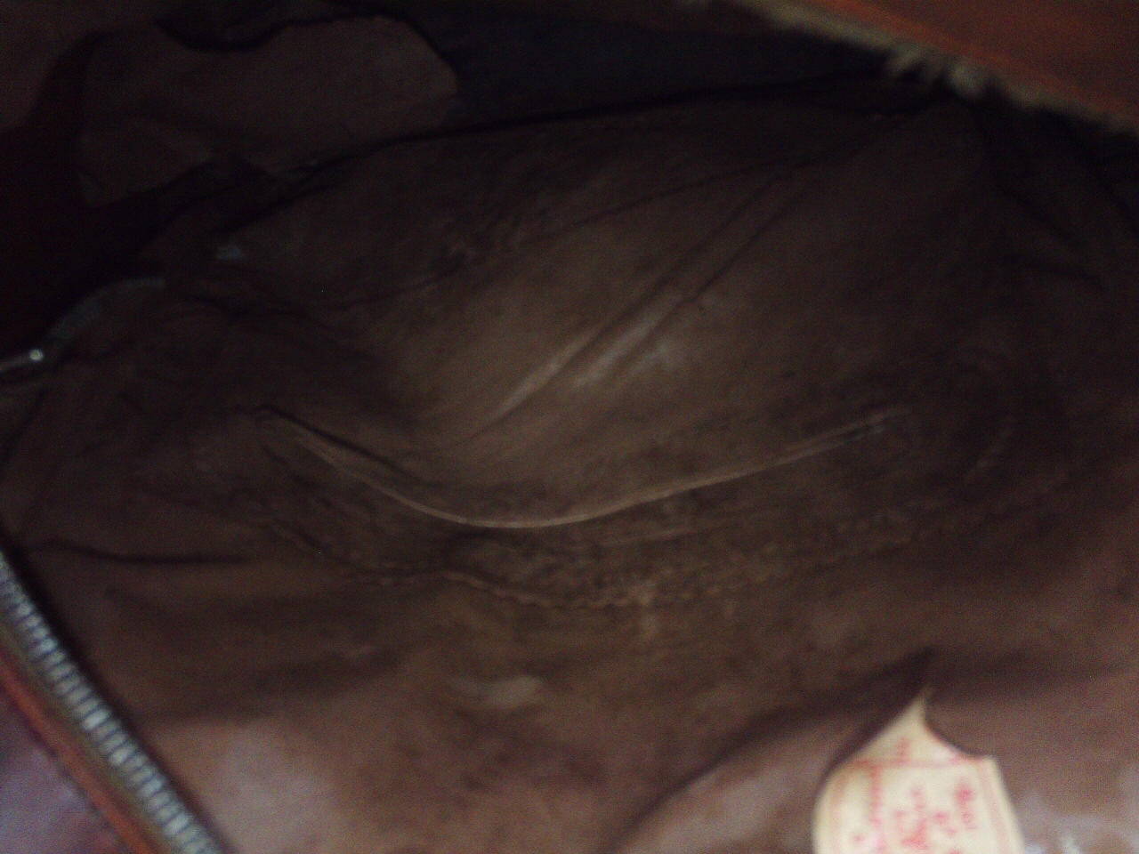 Изделие изготовлено из кожзама. Верхний ремень не заводской, родной уже давным-давно порвался, но он был регулируемым. По цвету он был тёмно-коричневым как и торцевая часть сумки.