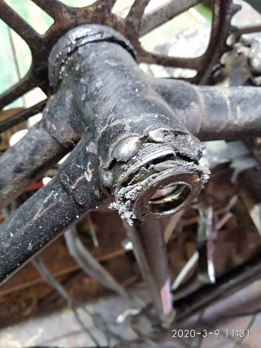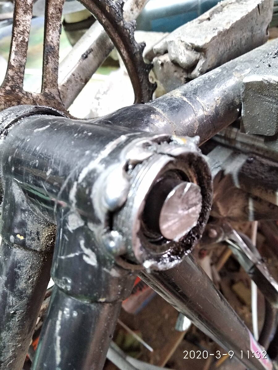 Срезал вал. каретка была на промах под клинья. явно не родная.шатуны приварены естественно.ну и накапали на левую чашку, ввиду того что каретка длинная и чашка зашла внутрь на 4 оборота. прихватили хоть не сильно. резьбы вроде в норме . еще какие то два отверстия с болтами в районе рулевой. непонятно заводские или нет? На вилке крыло было тоже приварено. (заберите кто нить у них сварочник :cry: ). Сегодня снял наклейки и отмываю краску которой закрашены родные декали. что то блестит....