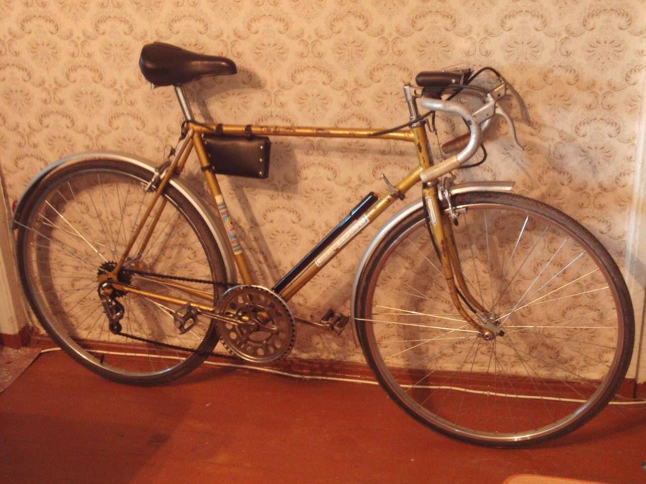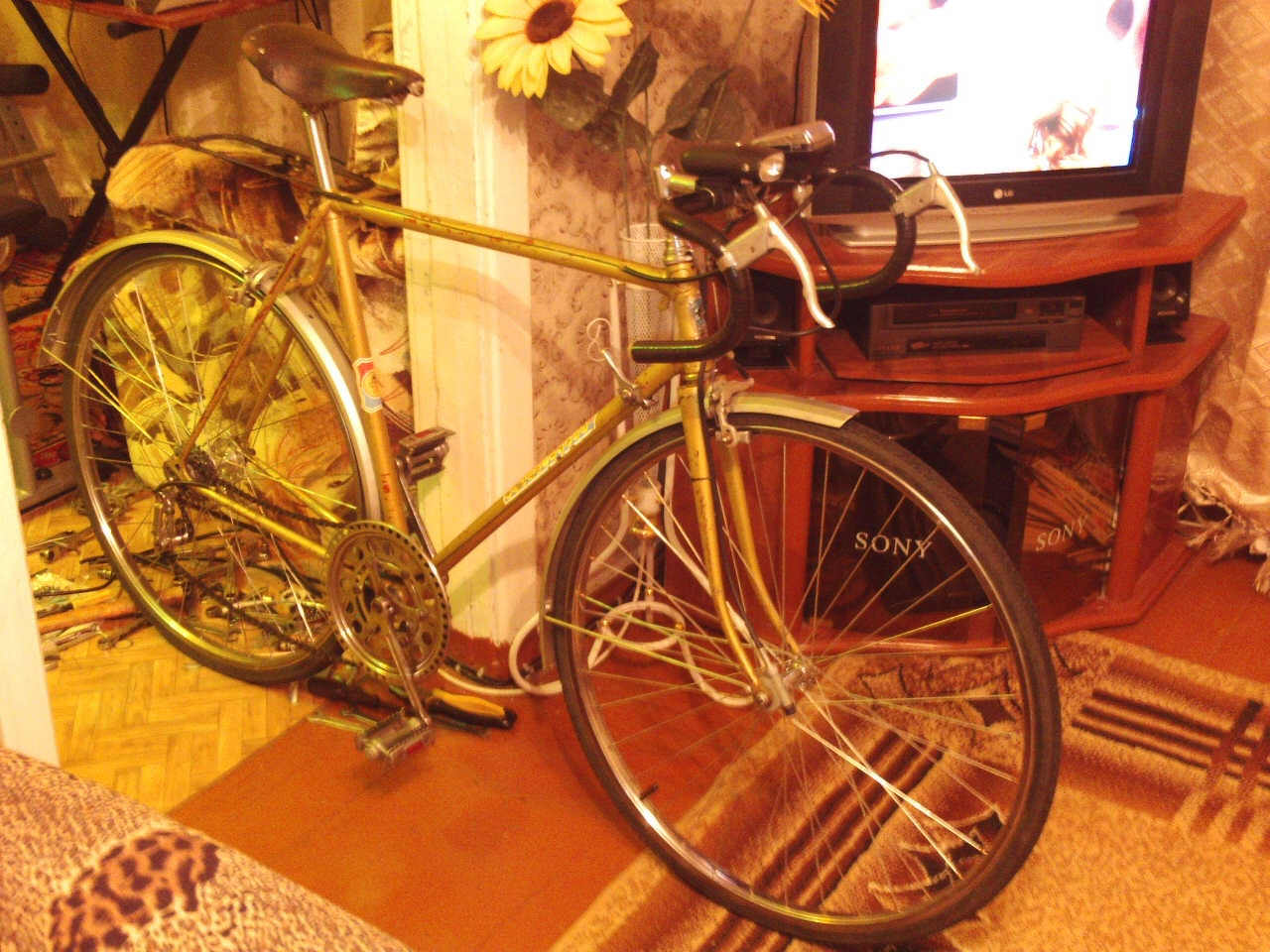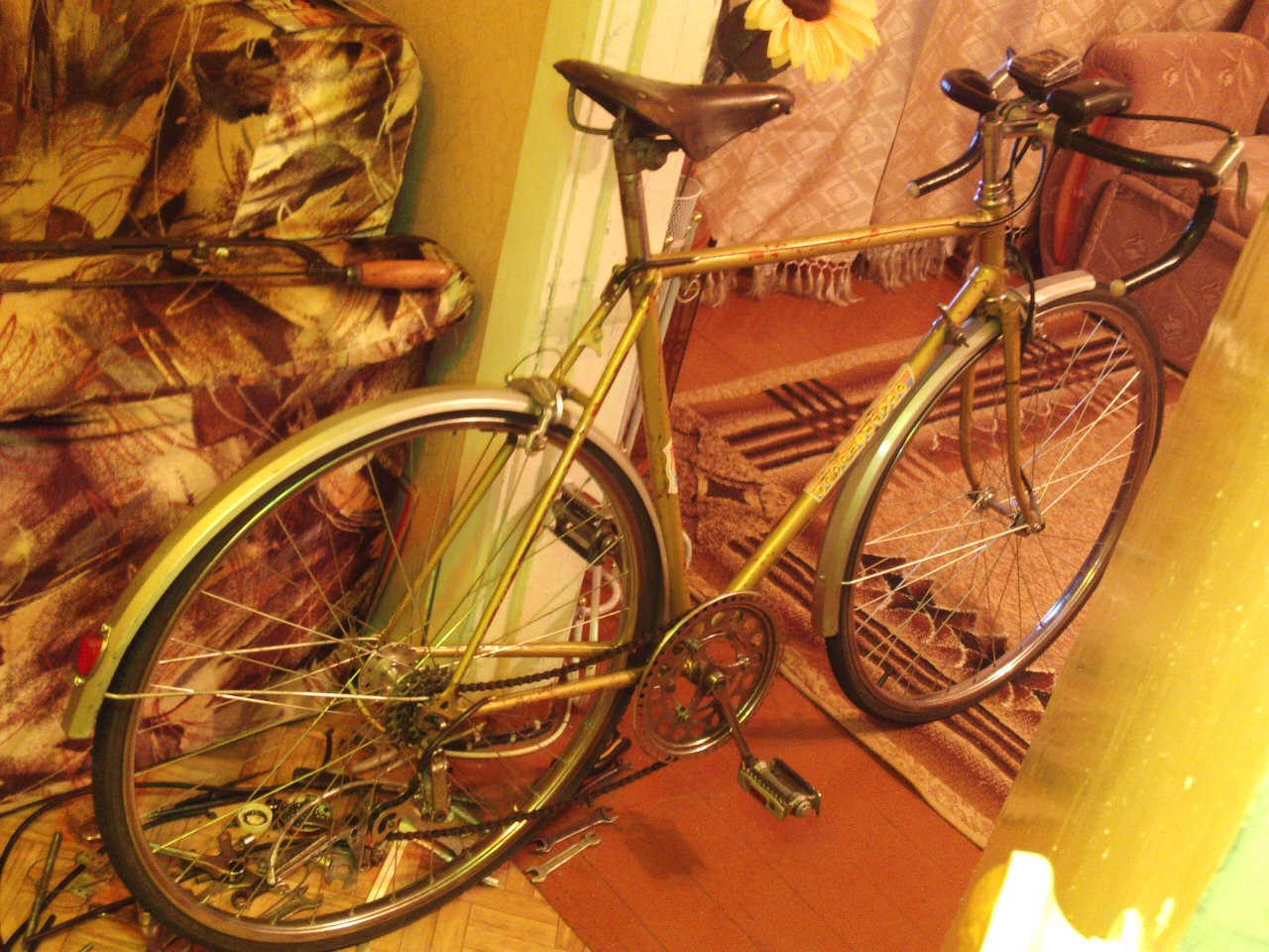 На очереди ещё один экземпляр эпохи 80-х - "Старт-Шоссе", модель 155-411 золотистого цвета, вернее сначала он был красного цвета но почему-то он был перекрашен в заводских условиях Харьковского велозавода в золотистый. Цель: собрать легкодорожный велосипед. В общем он будет аналогичен собранному и в последующем разобранному мной "Спутнику" модели 153-424 (1982г.в.). Фото исходного материала и предпологаемого в итоге окончания работ по восстановлению прилагаются далее.
