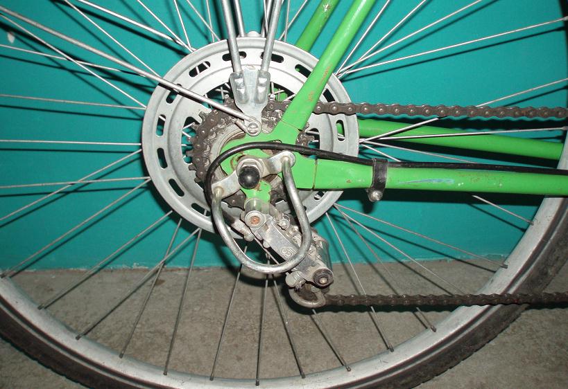 Так вот обвес очень напоминал ваш: задний переклюк один в один, защита на нем, тросики также шли полностью в рубашках и крепились к раме пластиковыми хомутами, тормоза такие же, как клещи так и ручки; сзади 4 звезды с такой же защитой, седло, обода, гайки колес. На фото не видны втулки колес, (у меня они состояли как-бы из двух частей, правой и левой, соединенных посредине) а также каретки (может все таки минского образца)