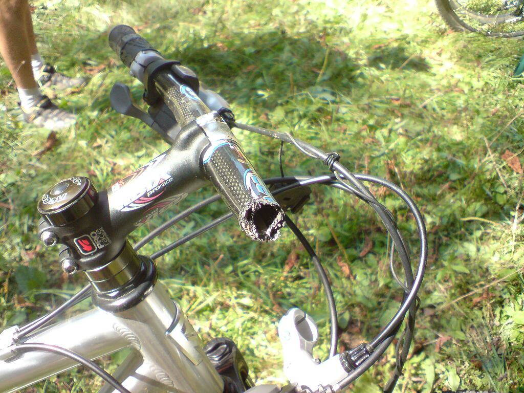 Участник гонки (есть на фотках Жаклин) на сложном ( и на мой взгяд бессмысленно очень опасном :evil: ) участке потеряв управление столкнулся левой стороной руля с железобетонным столбом ограждения и от массы велосипедиста при ударе правая сторона лопнула.