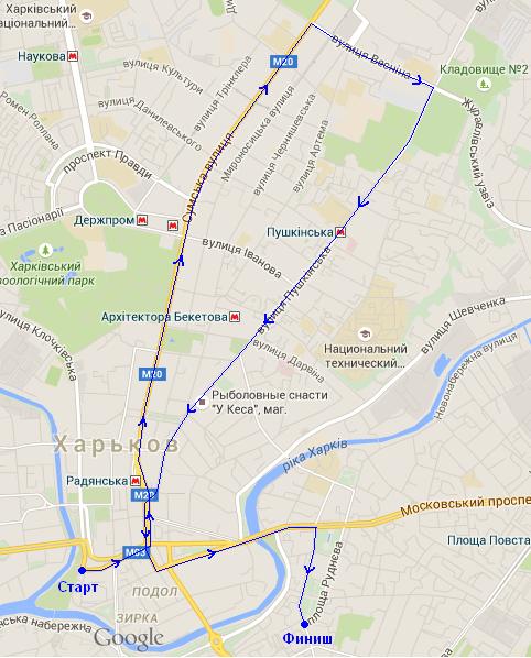 Маршрут: Нетеченская набережная – ул.Сумская – ул. Пушкинская – Московский проспект -- площадь им. Руднева.