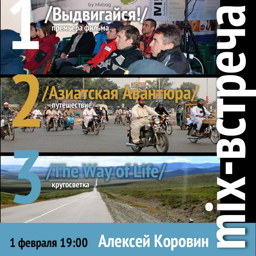 В середине октября 2011 года в Крыму, на берегу Черного моря состоялась встреча путешественников, которая впервые проходила в формате MIX. Участников Миксовки объединяет образ жизни в движении, а способы перемещения уже не так важны. 50 путешественников рассказывали о своих приключениях, делились идеями и планами о будущих тревел-проектах, знакомились и общались с единомышленниками. Организаторы Миксовки создали фильм об этой встрече и её участниках. Они рассказывают о том, что значат для них путешествия, как они это делают и почему. На встрече пройдёт премьерный показ фильма, и Алексей Коровин расскажет о Миксовке.