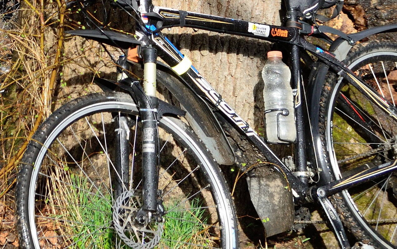 3. Одно переднее крыло все равно плохо защищает. Вот тандем с крылом еще и на раме помогает более менее держать в относительной чистоте и систему с цепью. Ниже на фото понятно. Хотя у меня не самый дешевый вариант из SKS Shockblade и Mud-X, с небольшой доработкой. Ну и ... на фото там на гориллу еще крыло из папки прилеплено, хотя оно болтается, чтобы меньше зимой грязи летело на ноги вилки. Весной обычно снимаю... ну как руки доходят.