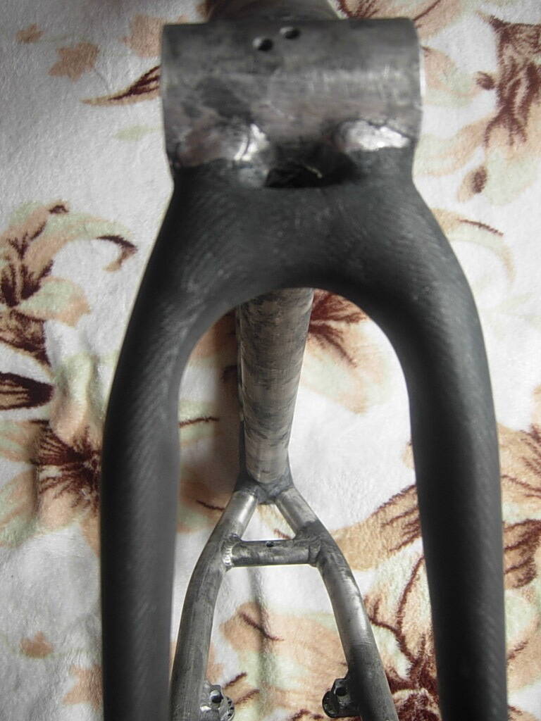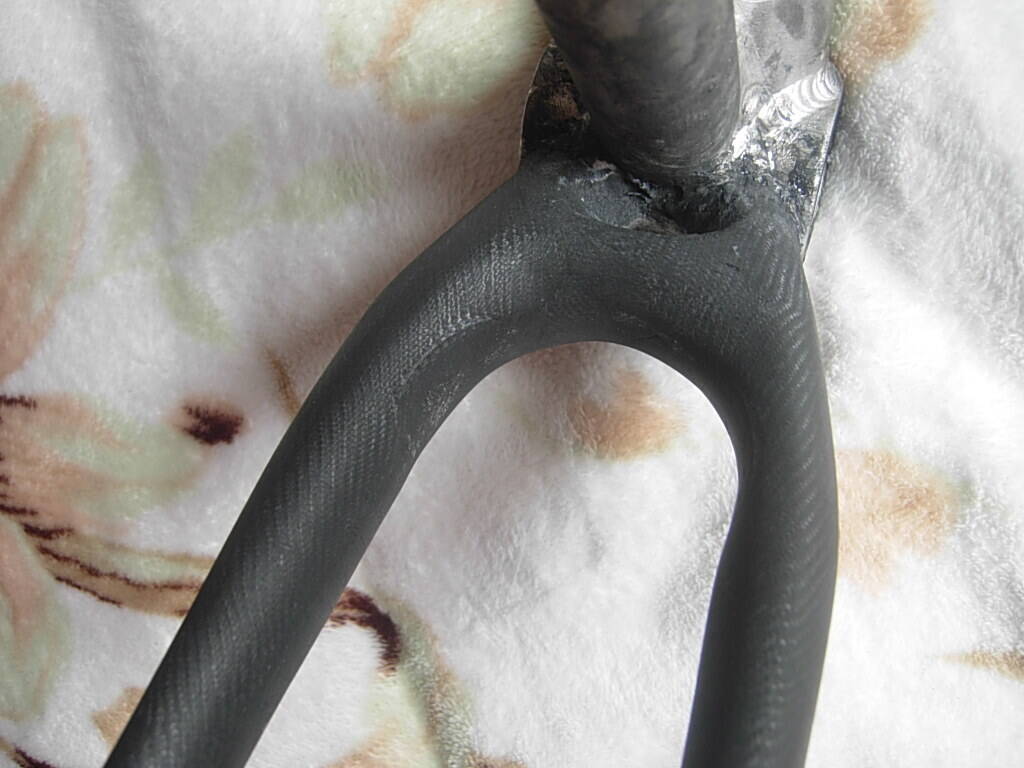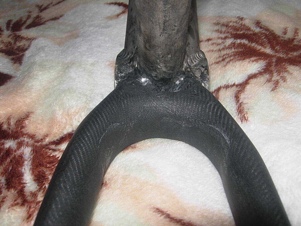 Почитав об усилении "Гарбаруками" нижних перьев карбоном, решил заодно и перья обмотать. Для этих целей была приобретена виниловая пленка "под карбон" углеткань и эпоксидная смола. Грязевой зазор между покрышкой и перемычкой на нижних перьях, при 2,2" резине был около 5мм. Спилил перемычку, потом понял что зря, можно было срезать только половину толщины. Перья сделал ассимметричными по примеру рамы Гарбаруков (левое перо, возле каретки, толще правого) и вклеил новую перемычку вылепленную из углеткани.