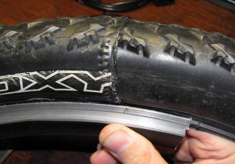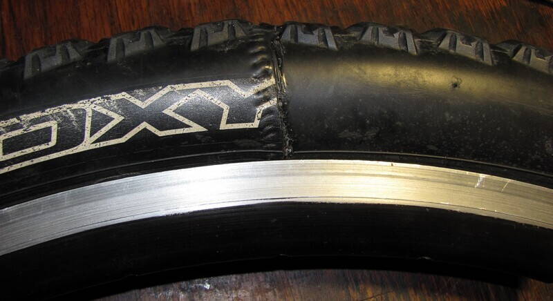 Скотт-Охид довольно тяжелые покрышки, много резины на бортах. Изза этого корд при нахлесте верхнего слоя ощутимо не догонял корд на нижнем слое покрышки. Но заправка в кусочек обода и распирание изнутри пальцем (имитация раздутия камеры) показало, что в борт будет "стегиваться" верхний слой покрышки, а нижний , подминаться вглубь.