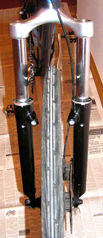 Первое, что не устраивало - пружинно-эластомерка РокШокс весом 2,5кг. Через год она таки была заменена на самую высокую (на нашем рынке) жесткую вилку Bike+ для 26" колес и весом 1кг. На этой вилке я проехал более 10 тыс.км по разнообразному покрытию и без оного :kayak: А вот крыло с 42мм резиной дружило скрипев песком :D Но главной проблемой был слишком крутой угол рулевой - порядка 74°, даже у шоссеров угол меньше :shock: Отсюда следовало слишком нервное руление :evil: