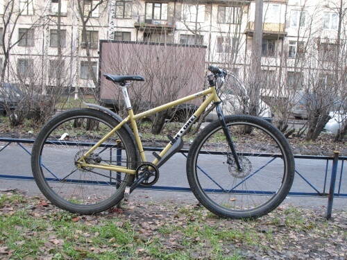 Получился приятный аппарат, весьма и весьма увесистый (по прикидкам около 14 кг). Ускоряется медленно, рвать не получится. Но катит и катит, скорость держать легко. Планетарка тоже приятна, в городе благодаря мгновенному переключению на месте. В походе, благодаря тому, что ничто не болтается, не цепляет за ветки и цепь лишний раз в воде луж не купается. Рама комфортная, не козлит, мягко ощущаеются все колдобины и ямы. Под рюкзаком просто как короткоход ощущается, ощутимо пружинит. С боковой жесткостью проблем нет.
