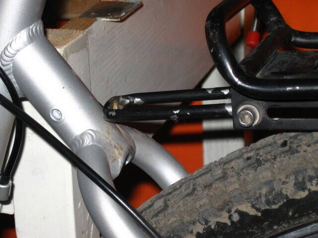 Вторая проблема - выступающий за плоскость рамы калипер заднего тормоза и винт крепления адаптера, который находится прямо посреди ноги багажника. Для теста проложил несколько шайбочек, оказалось отодвинуть багажник надо всего на 6мм.