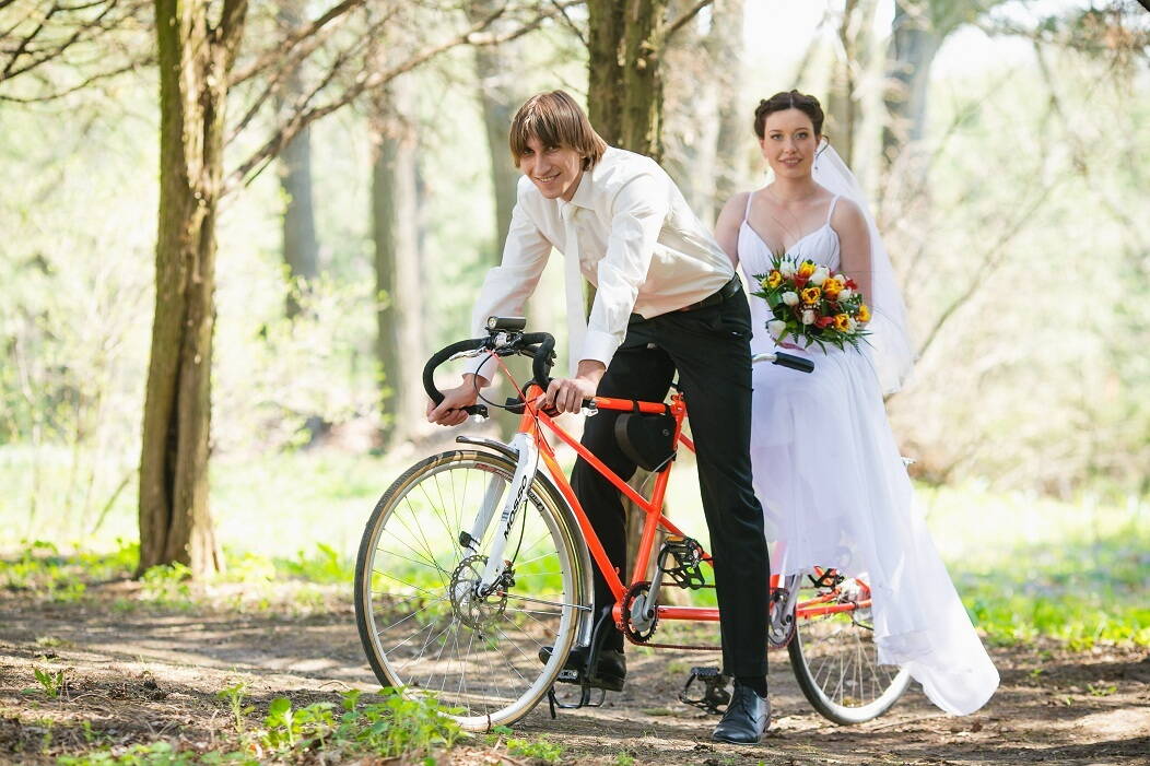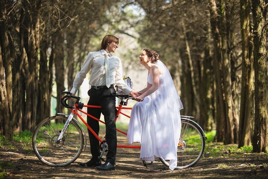 Что-то не похожи на вело свадьбу фотографии на тандеме, создается впечатление, что это просто обычная фото-сессия с использованием оригинального велосипеда, а молодожены очень слабо смахивают на велосипедистов, особенно невеста (вряд ли в таком платье можно было бы далеко уехать на байке)