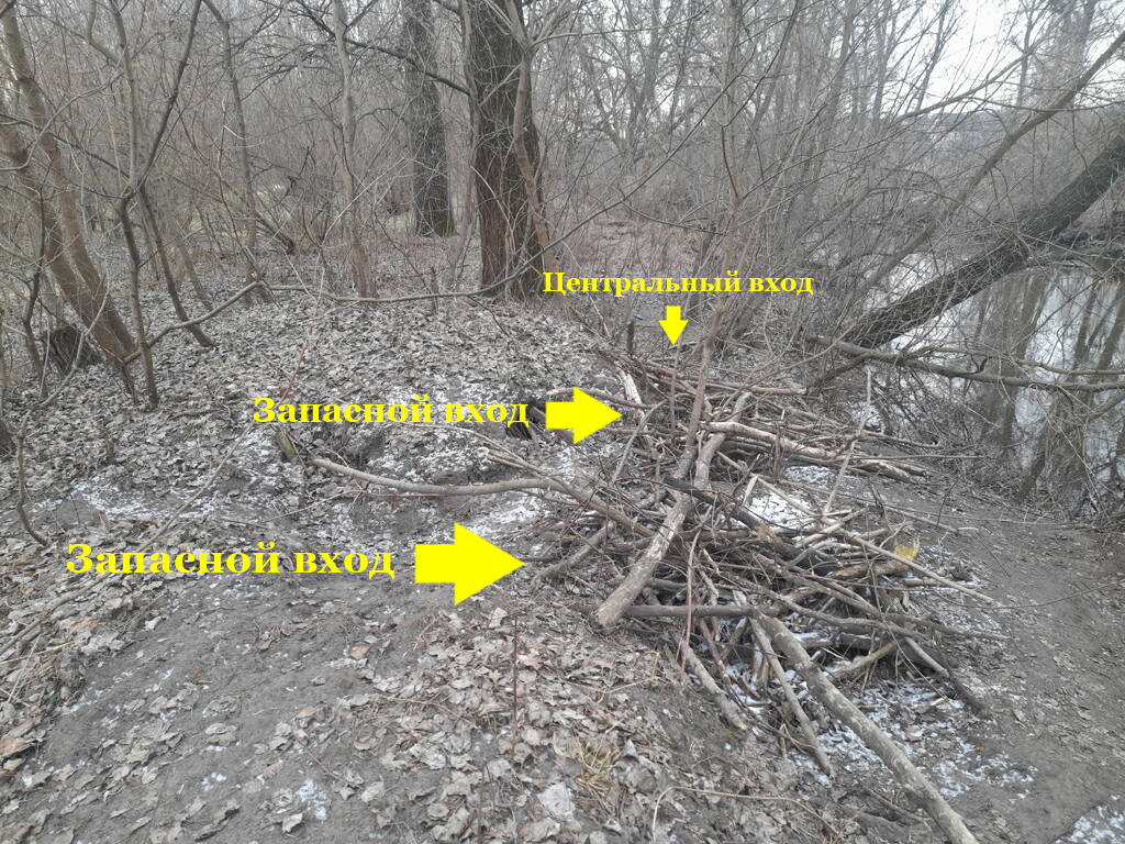 Нашёл нору, с центральным и запасными (заваленными ветками) входами/выходами (вначале тропы, возле 1-го бугра)..., между ними проложены хорошо утоптанные тропы. Влево и вправо, (примерно метров на 50) очень много сгрызенных молодых деревьев.