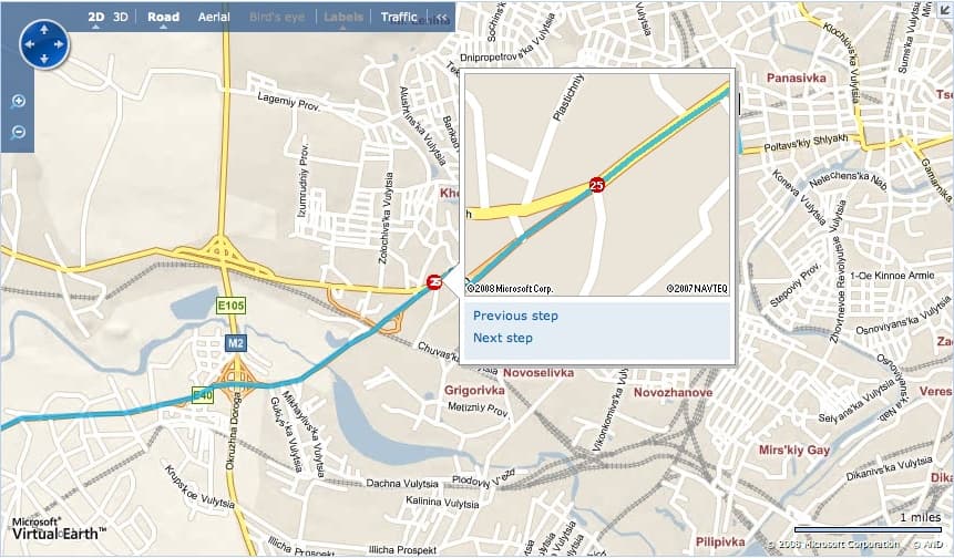 Суть точно та же, что и у Гугля. Только вот Майкрософт, который не очень то почему-то гонится за деньгами, детализировал ВЕСЬ мир, а не потенциально доходные страны, как это сделал гугль. Вот например, на мелкософтовском сервисе есть полная карта Харькова. Да, дома не обозначены, поиск по улицам пока еще не работает, но, однако, путь от Киева к Харькову прокладывает точно, еще и с подсказками (см.рис). Т.е., дай бог, скоро будет и по улицам искать. В некоторых городах России, например, уже работает.