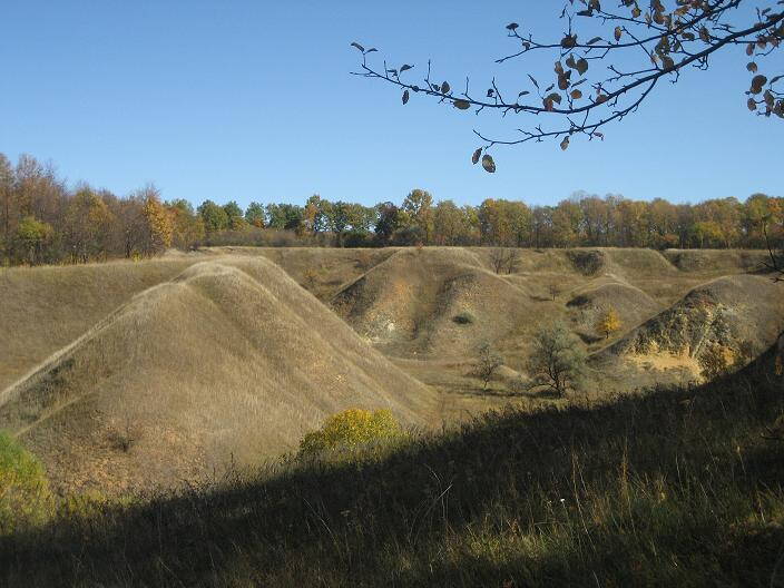 Место действительно очень живописное, и осенью, когда часть деревьев уже сбросила листву, а некоторые только покрылись жёлто-оранжевыми нарядами, там здорово. Но меня больше впечатлили не эти складки ( это искусственные полосы, здерживающие потоки воды для предотвращения сползание грунта) и озеро, а расположенные справа два огромных оврага, с многочисленными отрогами. Стоишь внизу, как в каньоне, и стены возвышаются на 30-20 метров.