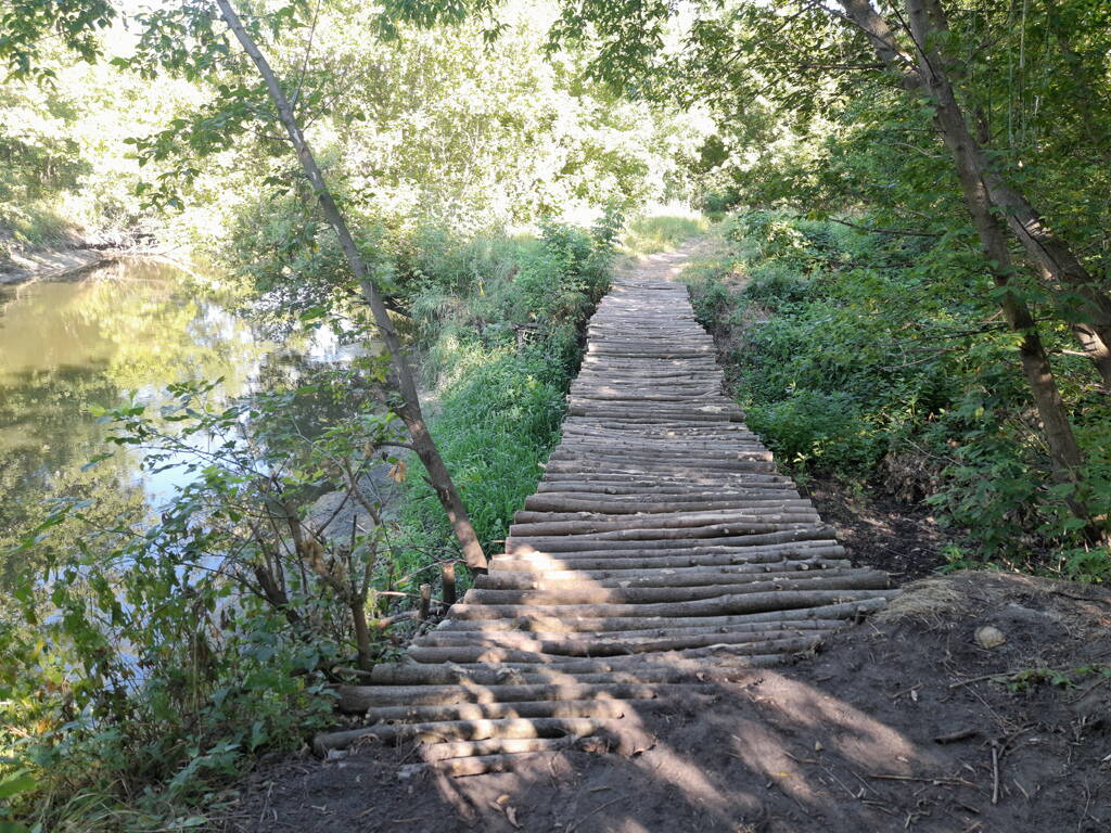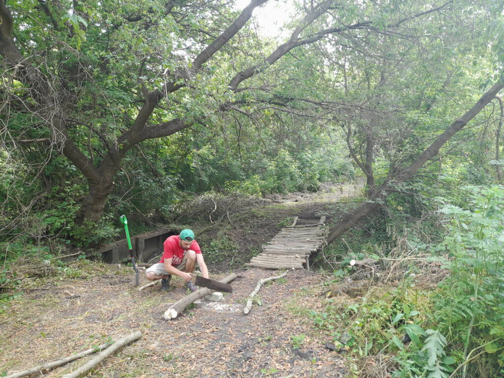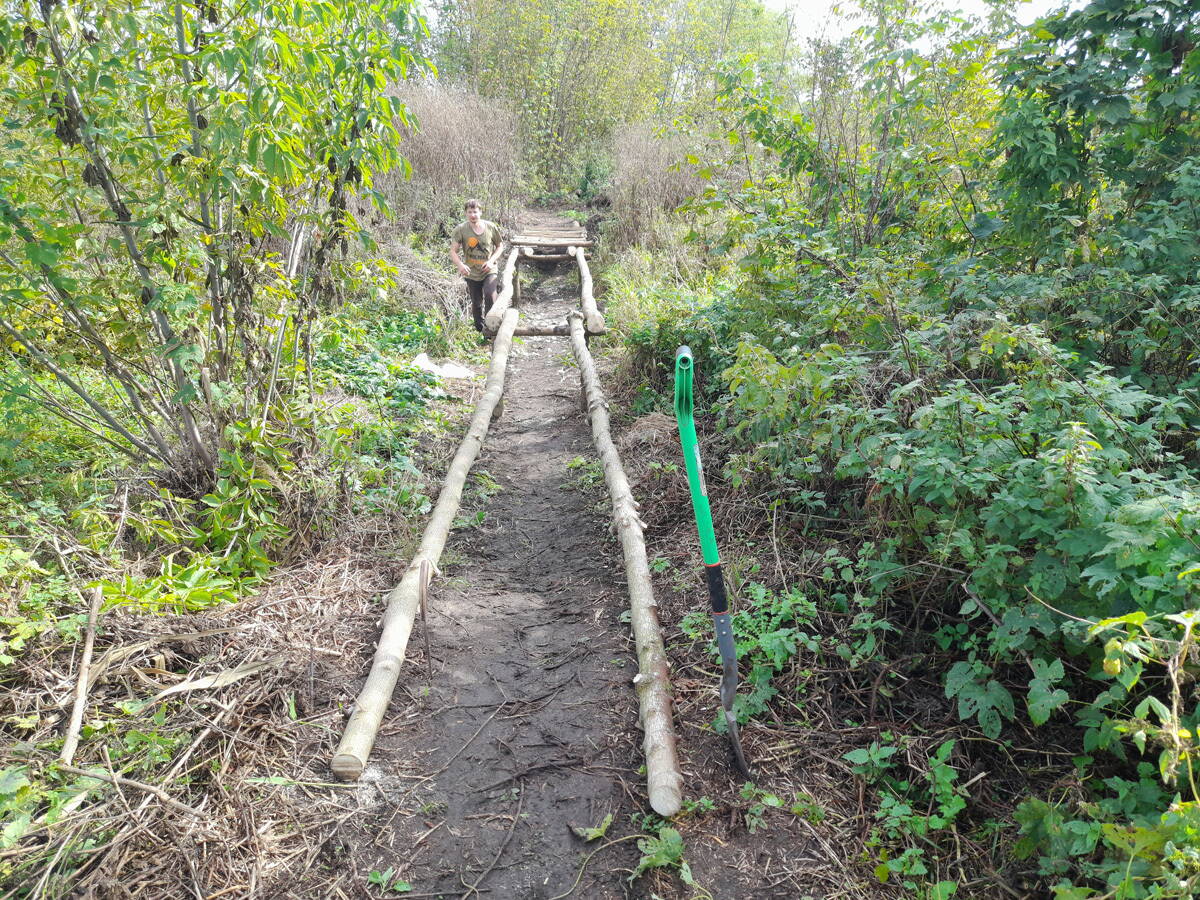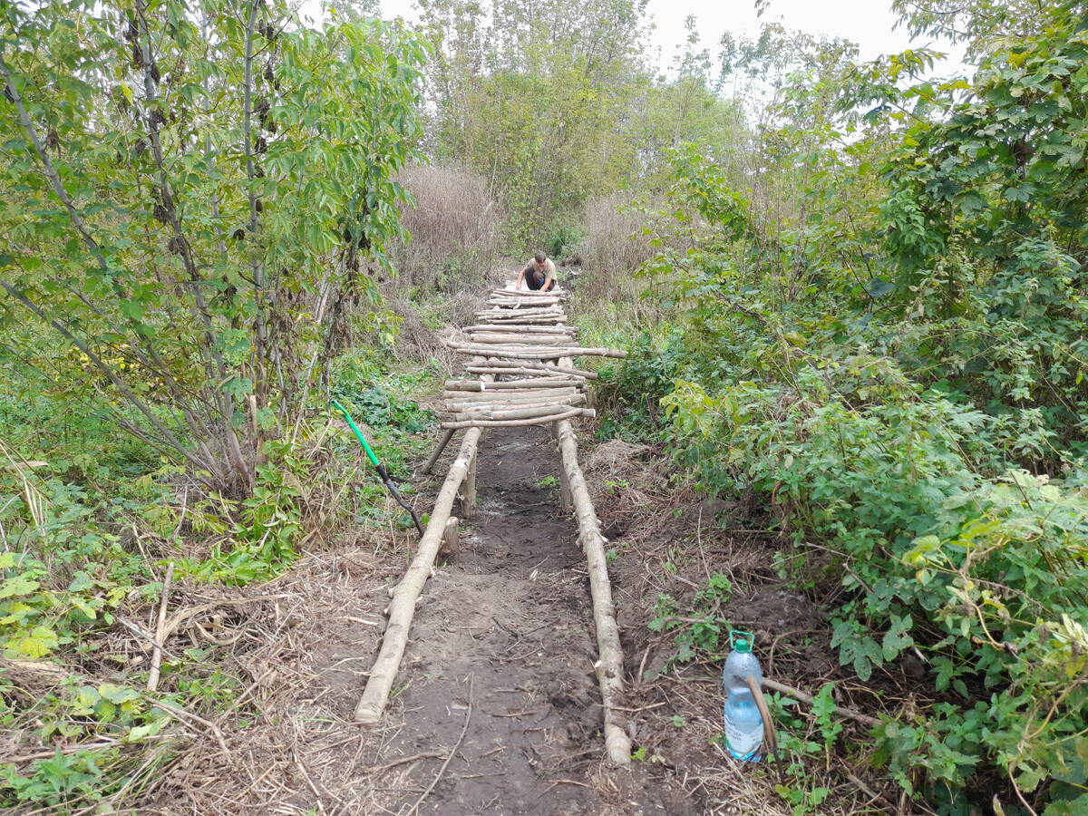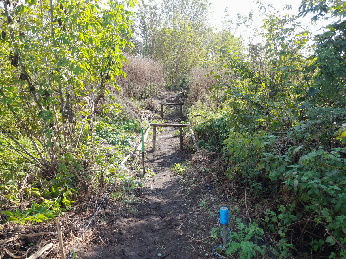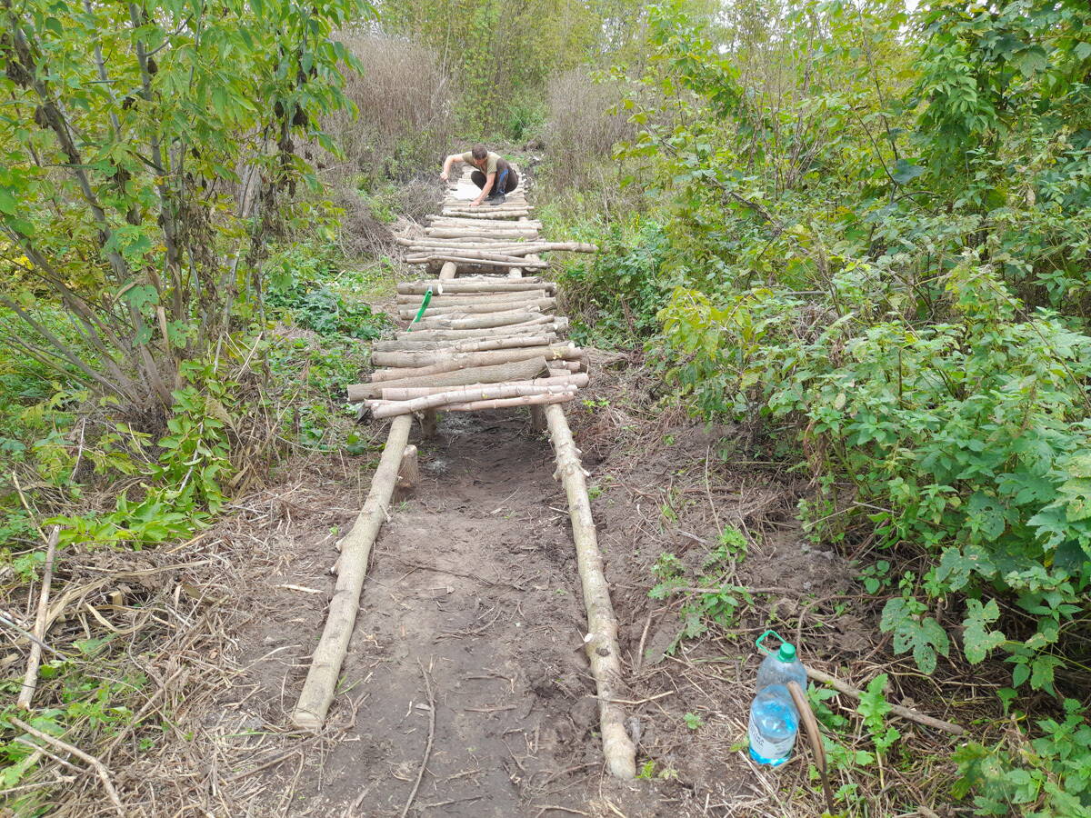 Метров 200, с начала маршрута, что-то наподобие тропы таки было, дальше — сплошной мрак..., мы выкосили уйму травы, разобрали немерено завалов и спилили мешающие нам деревья (инвазивные). Если посмотреть на карту, можно увидеть, что дорога есть, она проходит по лугу и в паре мест практически соприкасается с нашим маршрутом, но, её разбивают машины и квадроциклы, после дождей образовываются лужи..., из-за этого, нам и приходится воздвигать мосты, дабы вообще не выезжать на неё.