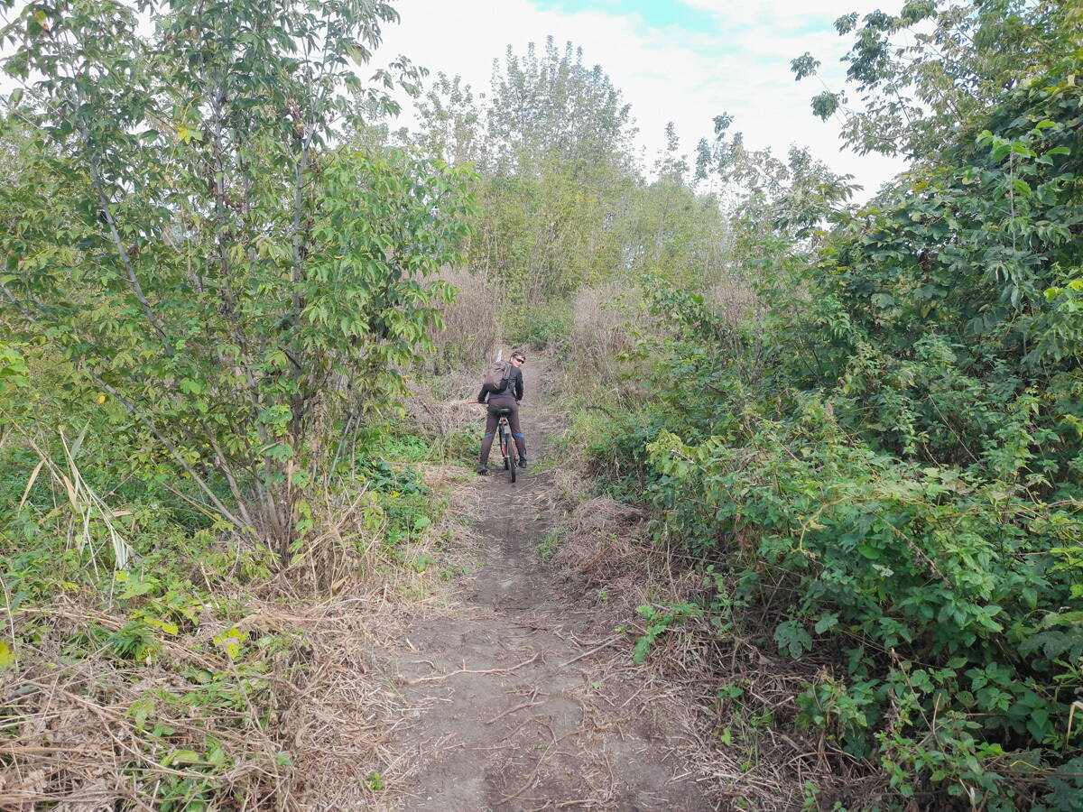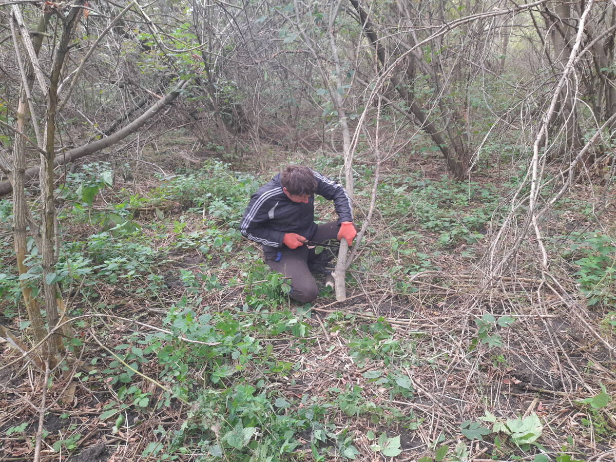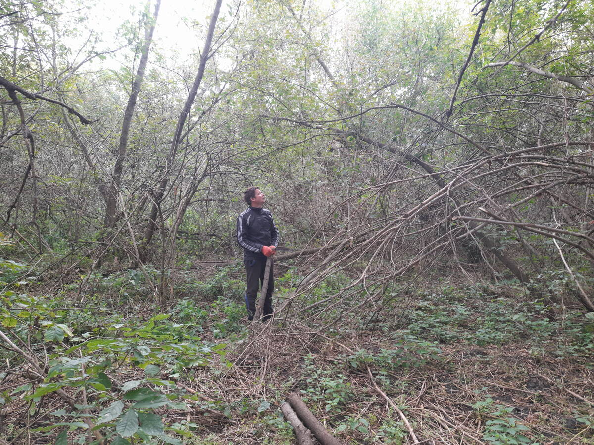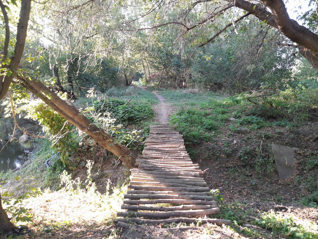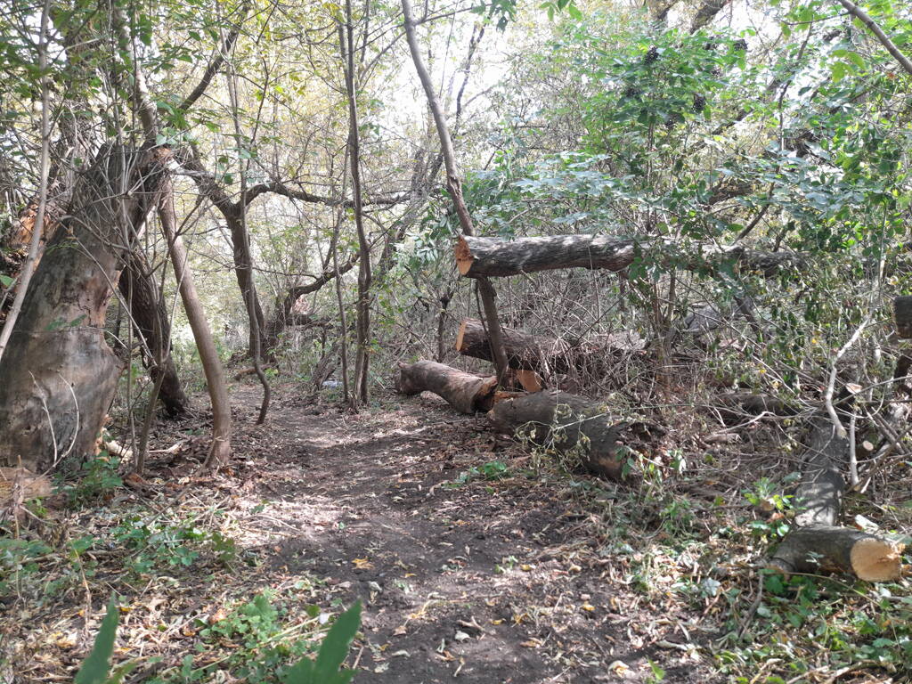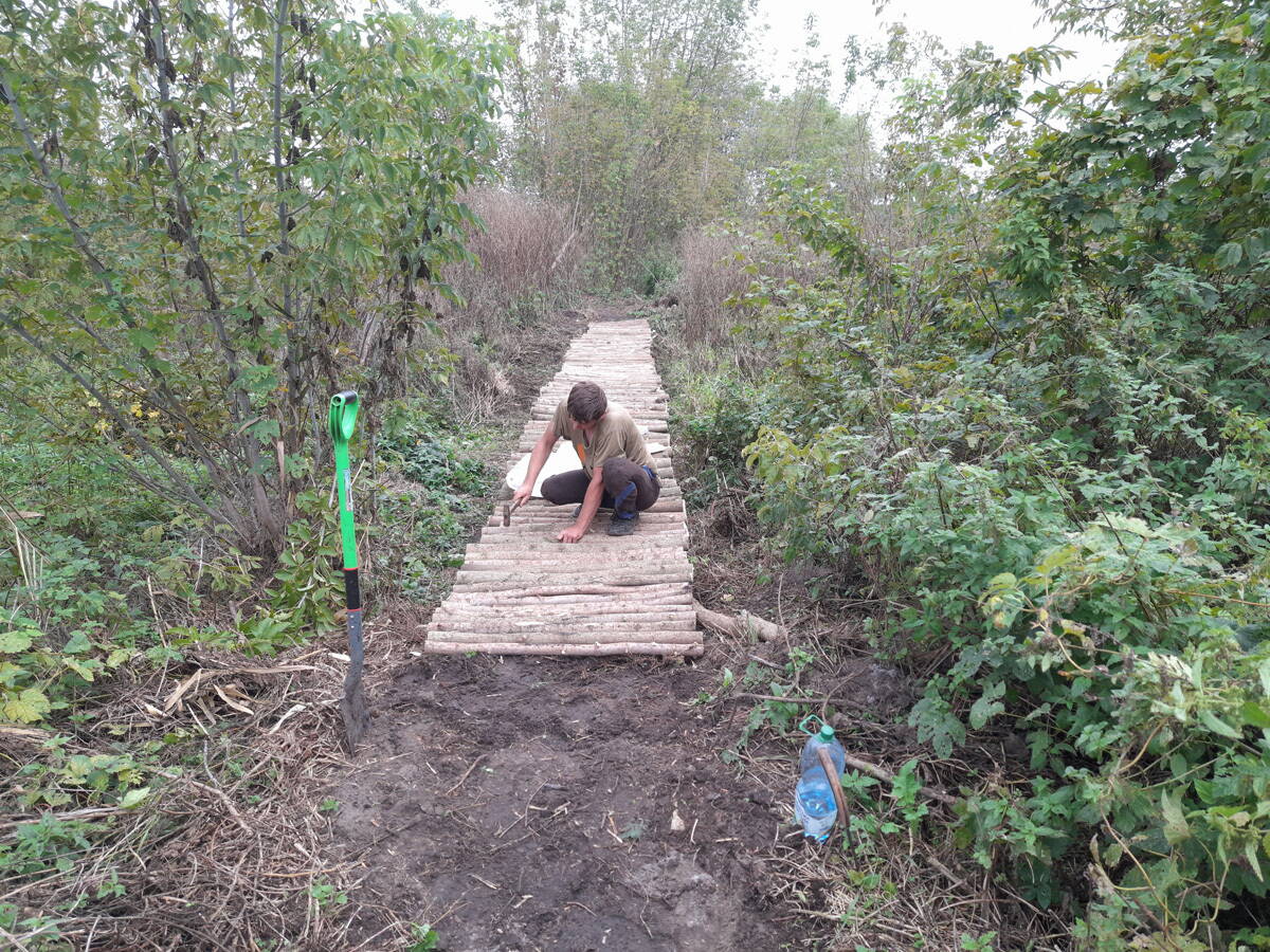 Метров 200, с начала маршрута, что-то наподобие тропы таки было, дальше — сплошной мрак..., мы выкосили уйму травы, разобрали немерено завалов и спилили мешающие нам деревья (инвазивные). Если посмотреть на карту, можно увидеть, что дорога есть, она проходит по лугу и в паре мест практически соприкасается с нашим маршрутом, но, её разбивают машины и квадроциклы, после дождей образовываются лужи..., из-за этого, нам и приходится воздвигать мосты, дабы вообще не выезжать на неё.