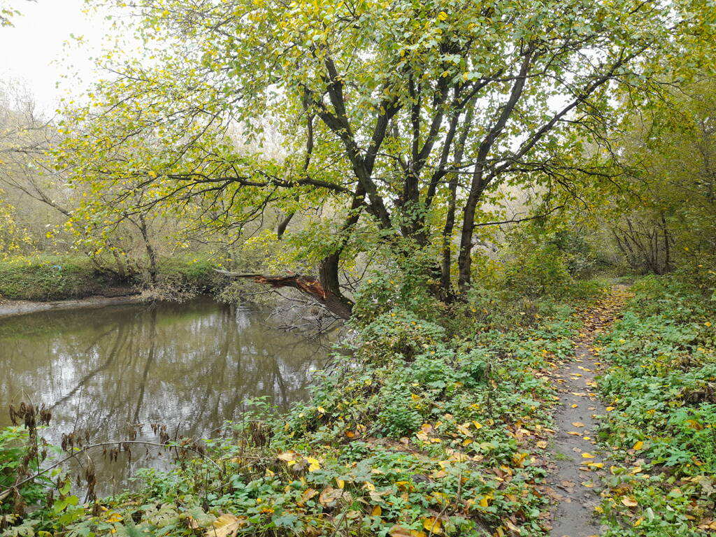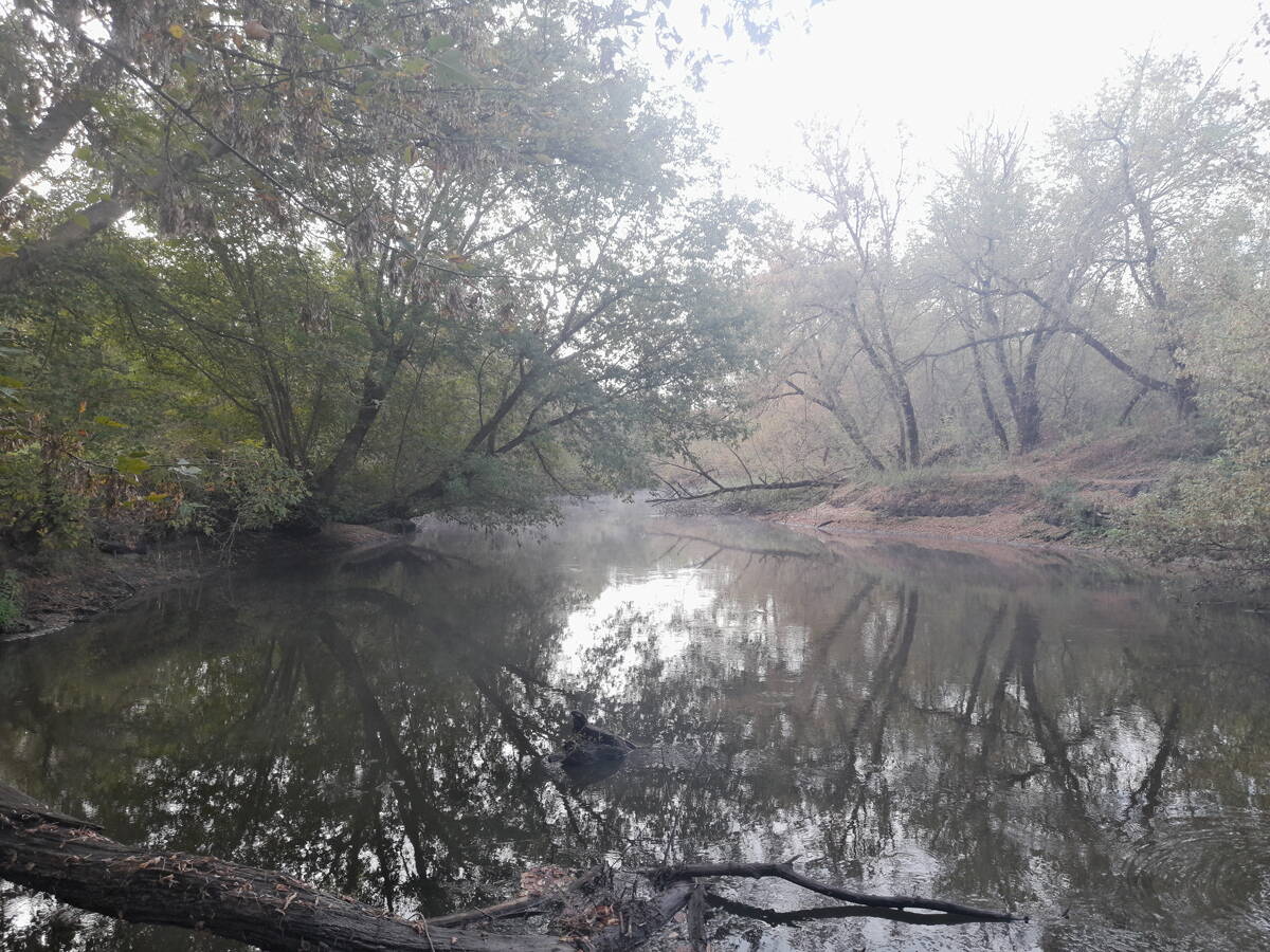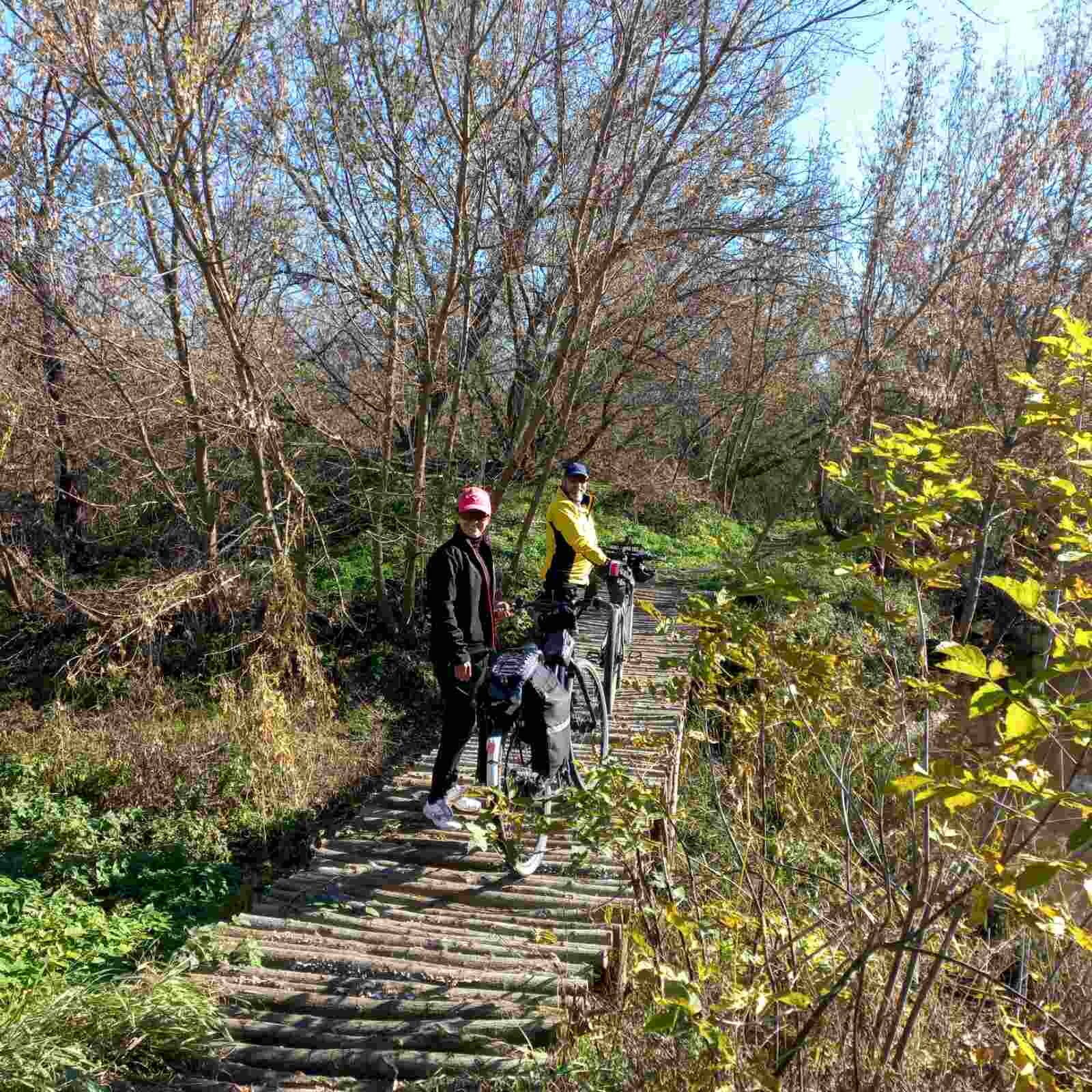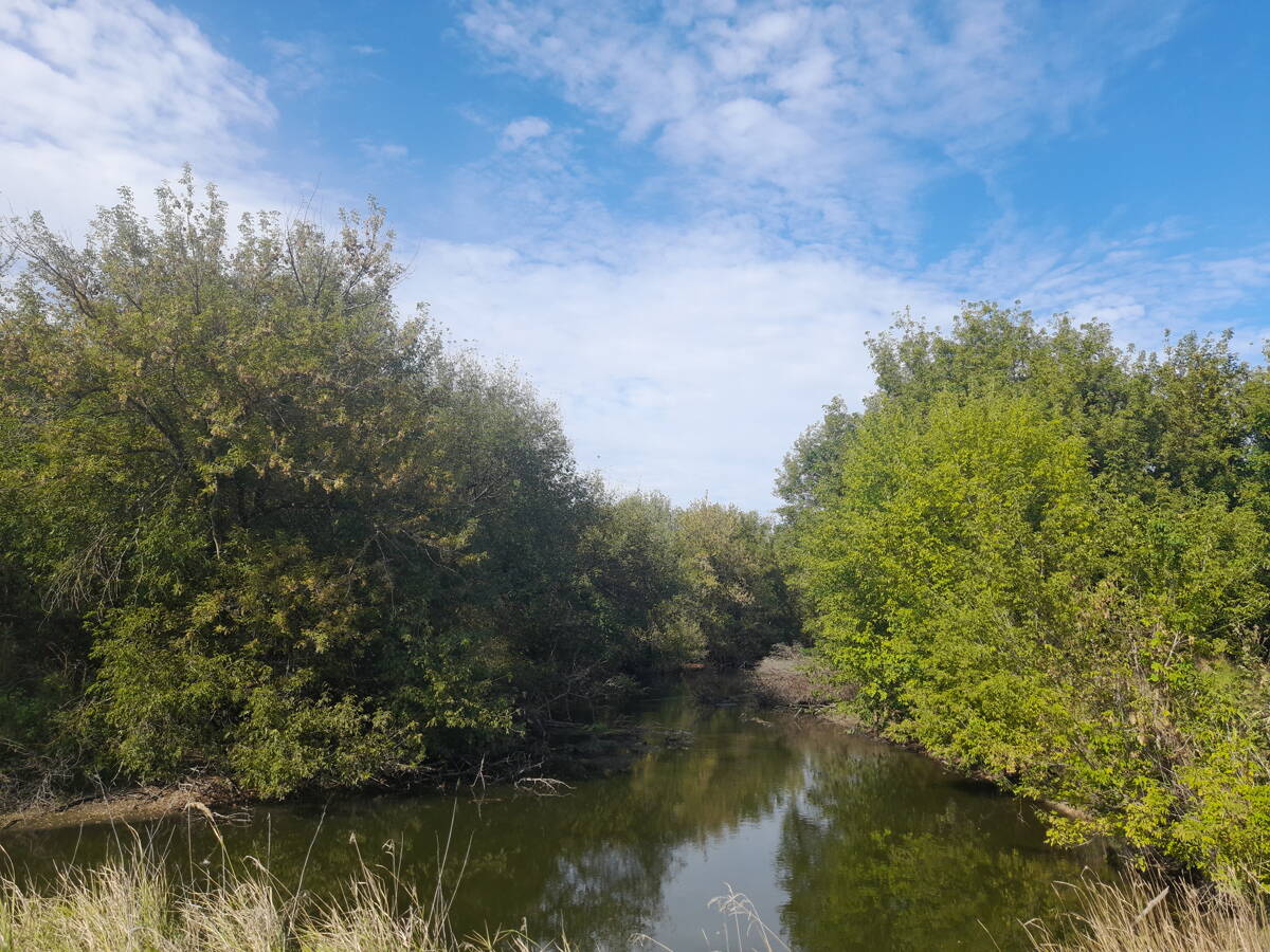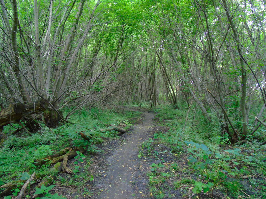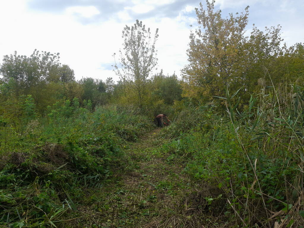Метров 200, с начала маршрута, что-то наподобие тропы таки было, дальше — сплошной мрак..., мы выкосили уйму травы, разобрали немерено завалов и спилили мешающие нам деревья (инвазивные). Если посмотреть на карту, можно увидеть, что дорога есть, она проходит по лугу и в паре мест практически соприкасается с нашим маршрутом, но, её разбивают машины и квадроциклы, после дождей образовываются лужи..., из-за этого, нам и приходится воздвигать мосты, дабы вообще не выезжать на неё.